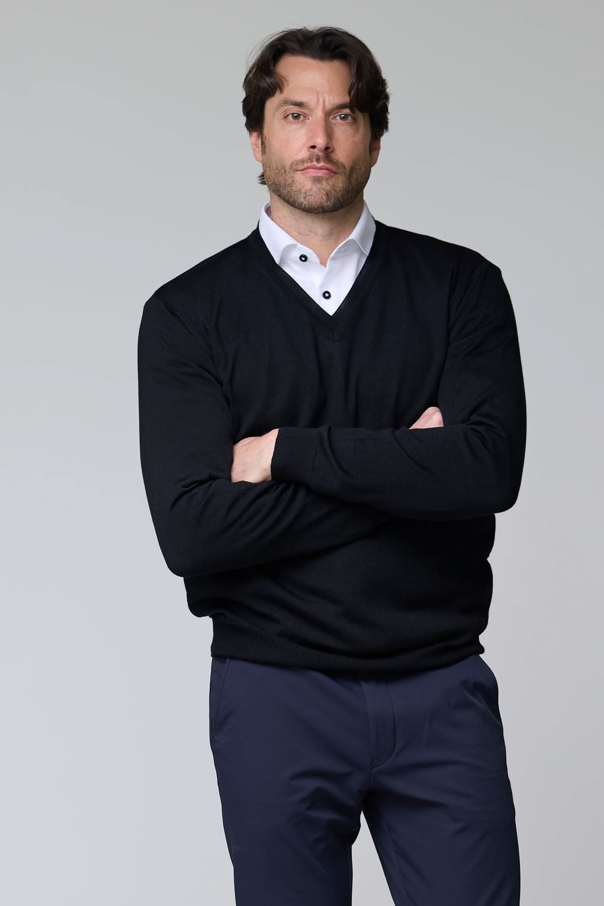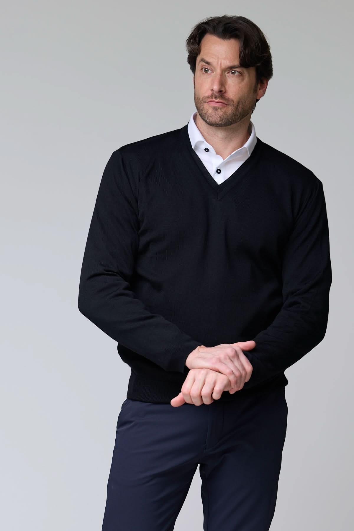 Description: Fine merino wool V-neck sweater with a soft, breathable texture. An essential piece in any man's wardrobe, perfect over a shirt for an elegant, timeless look.