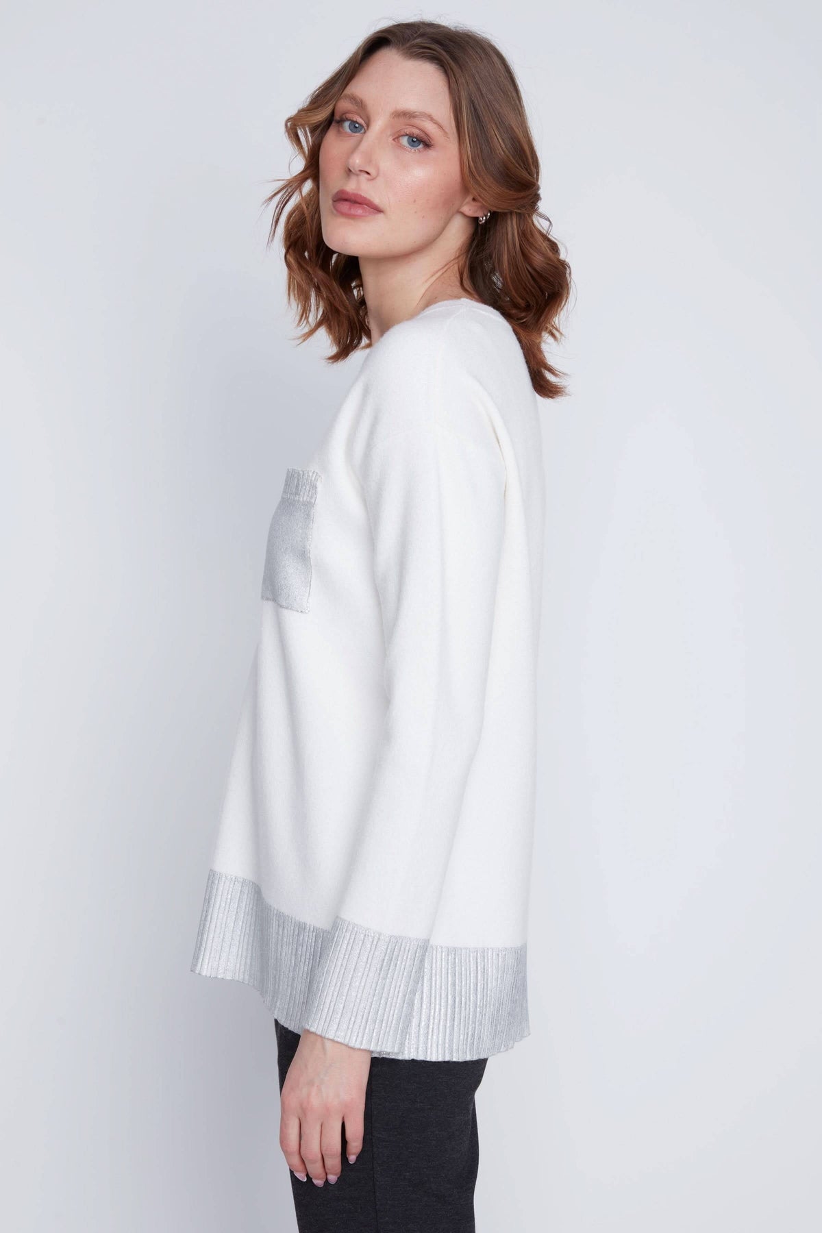 Description: This long-sleeved sweater features a sleek design enhanced with metallic details on the chest pocket and cuffs. Its straight fit and soft texture ensure comfort and elegance, perfect for a chic, casual look. Style tip: wear it with black or gray pants to bring out its metallic accents.