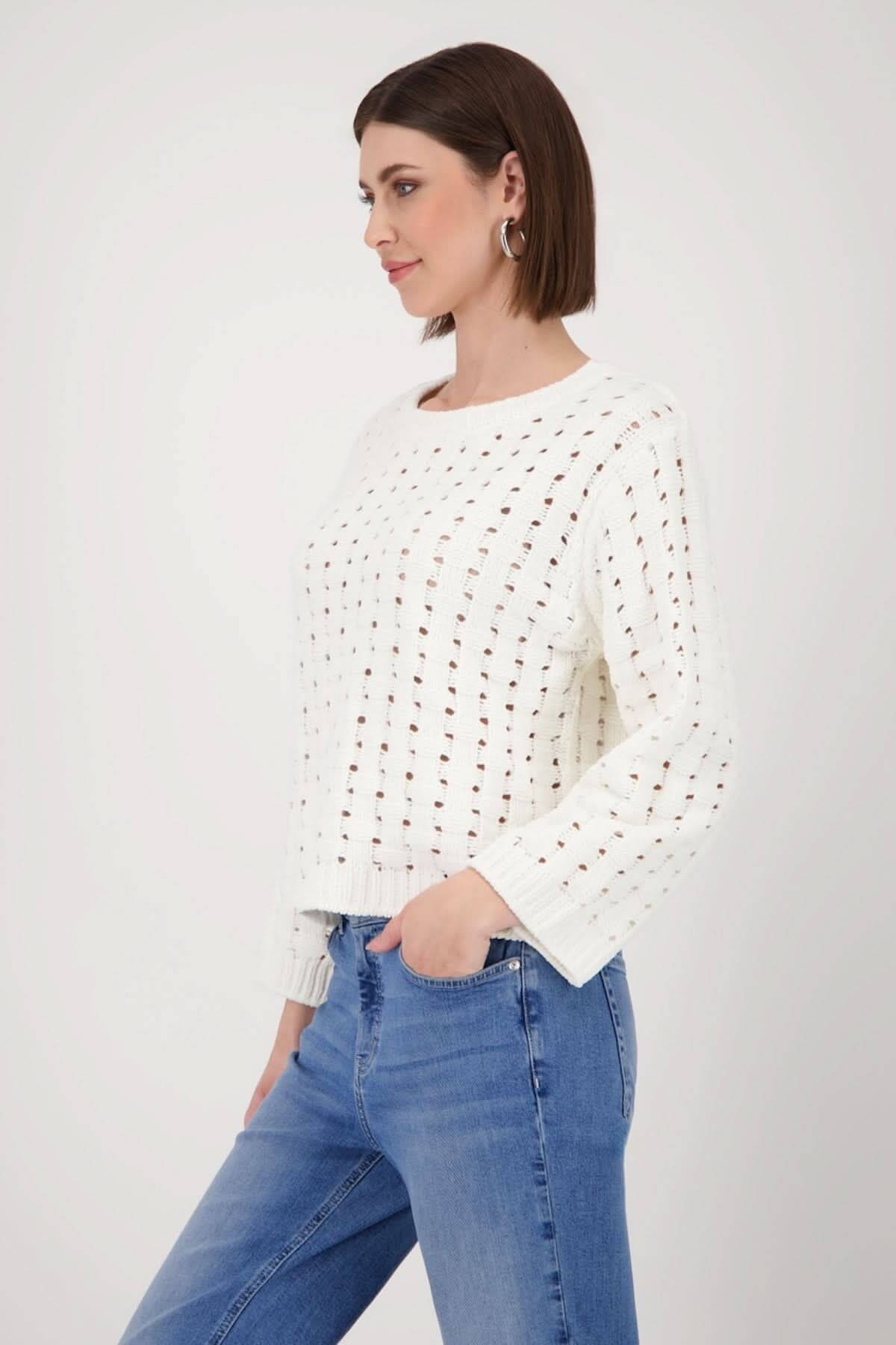 Description: This openwork knit sweater is sure to charm with its delicate, lightweight texture, perfect for a casual, feminine look. Its straight fit and round neckline offer optimal comfort, while the openwork pattern adds a subtle touch of elegance. Style tip: layer it over a tank top or contrasting top to play with sheer effects.