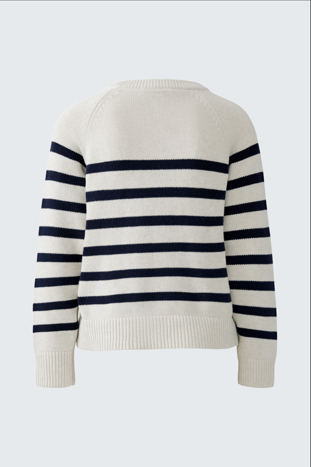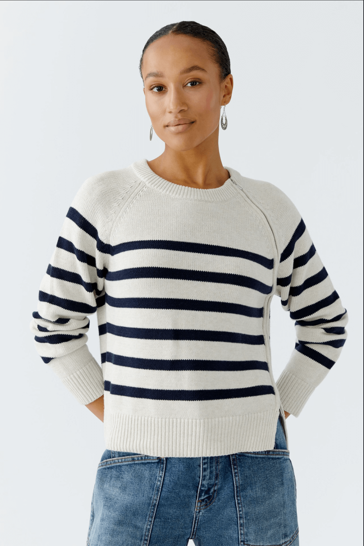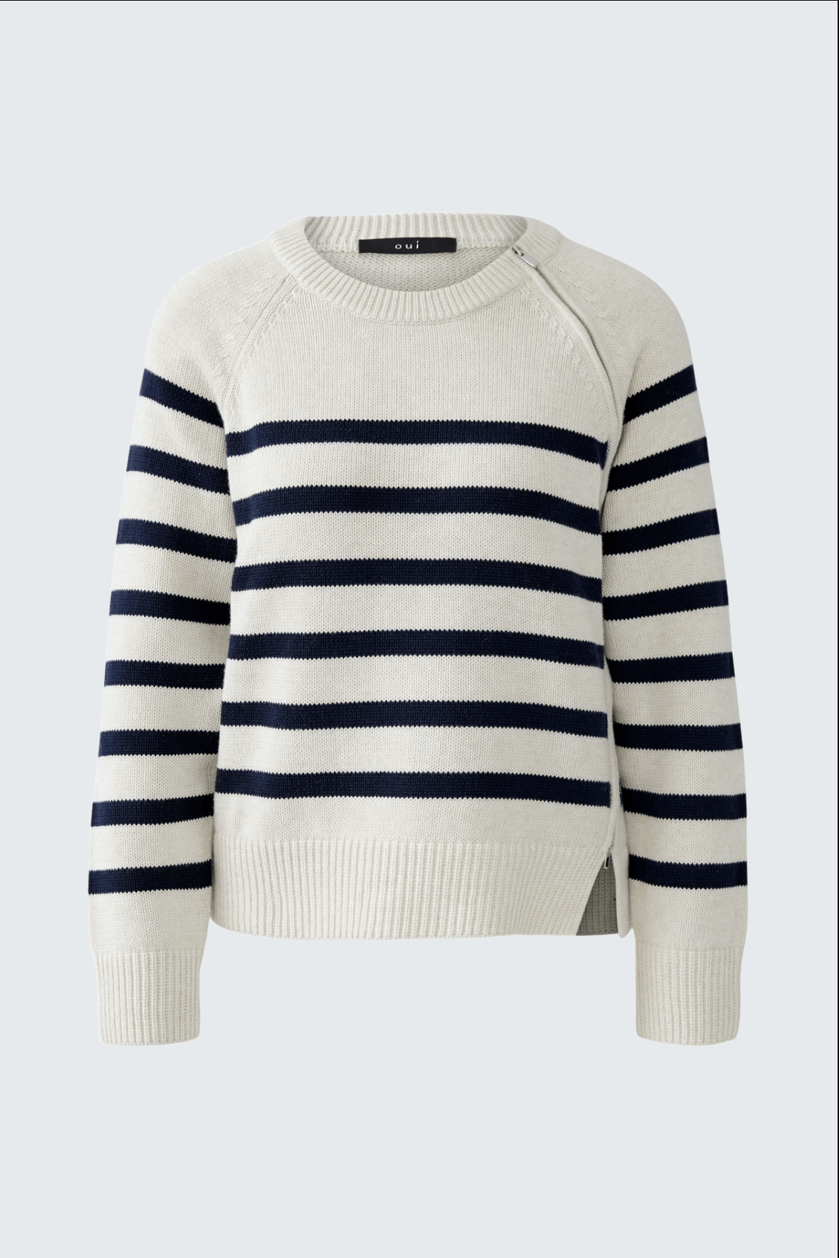 Description: This sweater features a two-way zipper along the raglan seam, offering a customizable opening at the neck or hem. Its relaxed fit and smooth striped knit in pure cotton give it a modern yet comfortable style. Wear it with jeans or slim-fit pants to balance its volume.