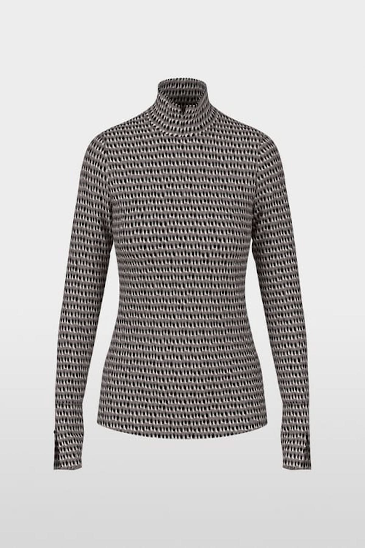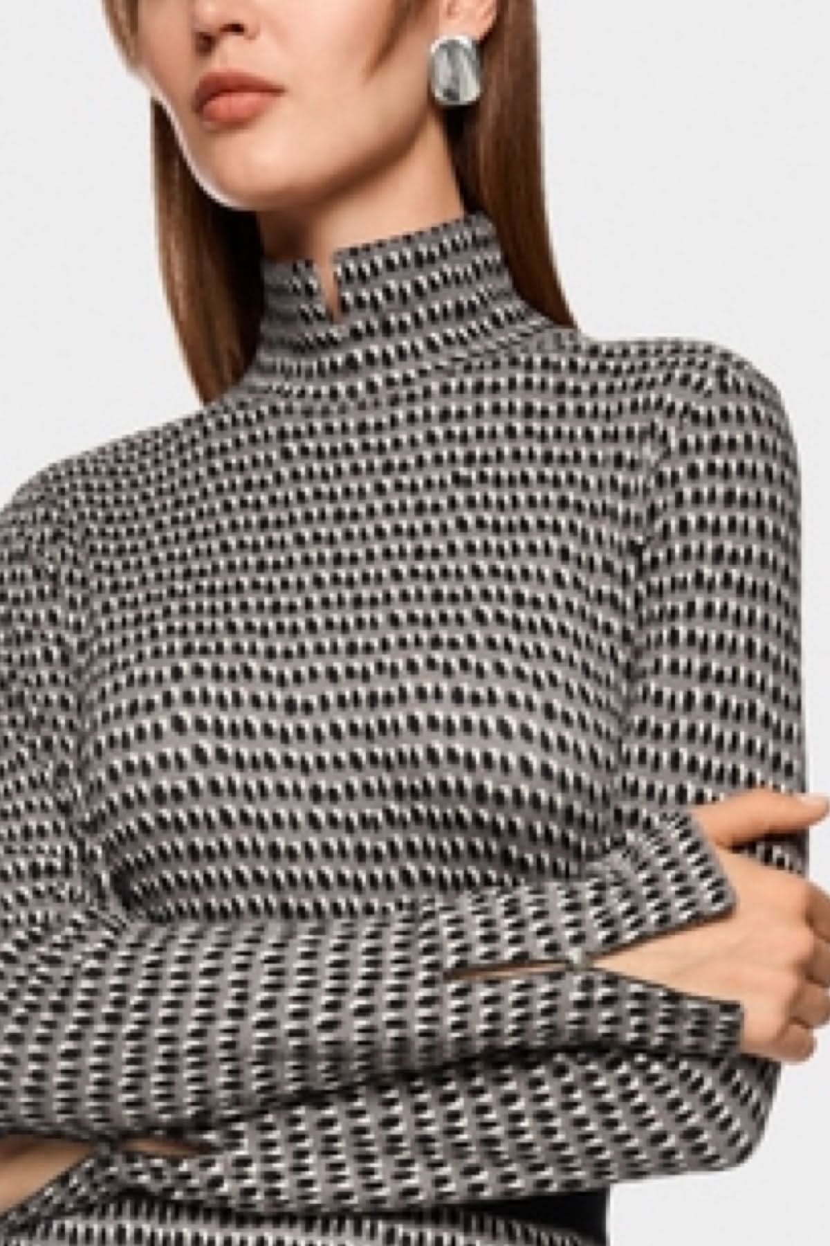 Description: Sweater made from a blend of soft materials with recycled viscose and mini sequins. The finely structured pattern and classic high neck give this style a modern, sleek look. This style is knitted and finished in Germany.