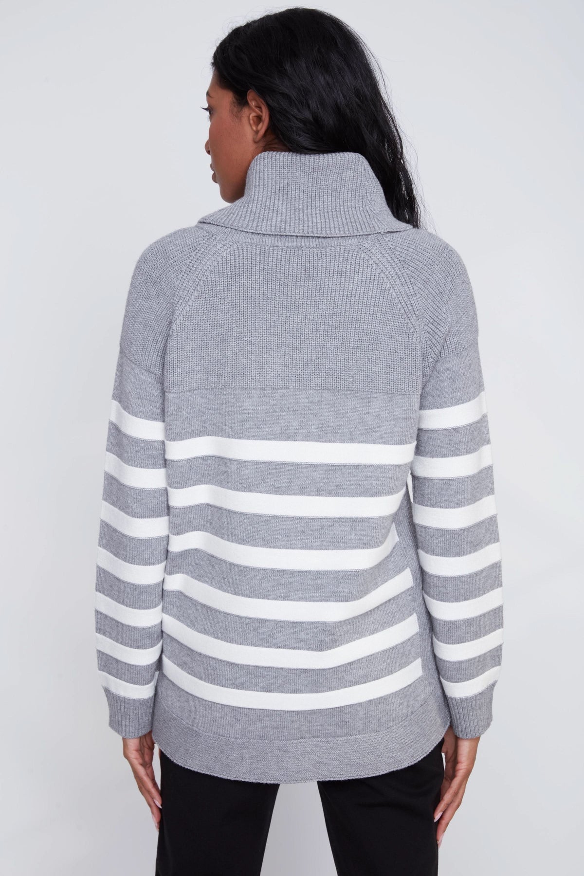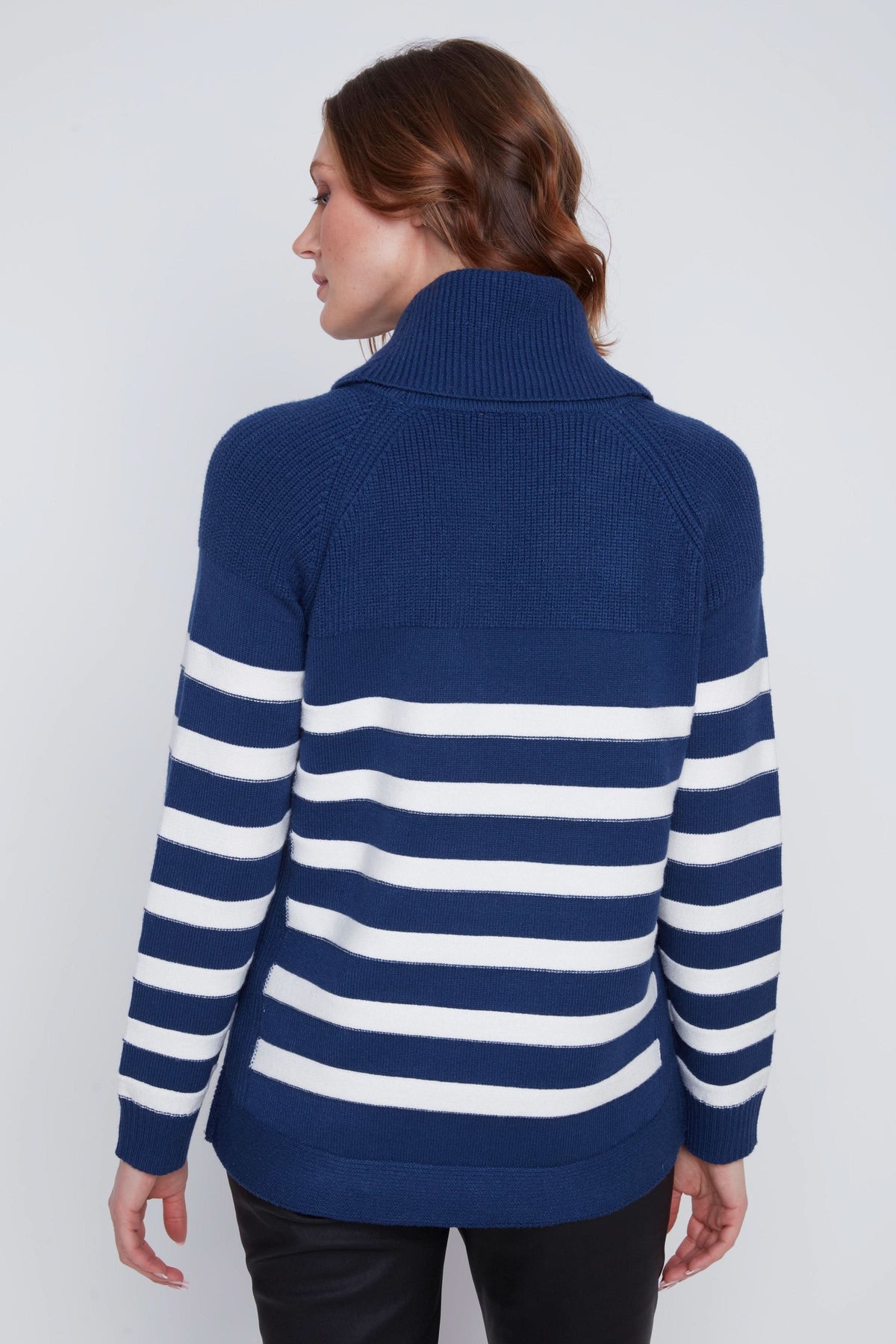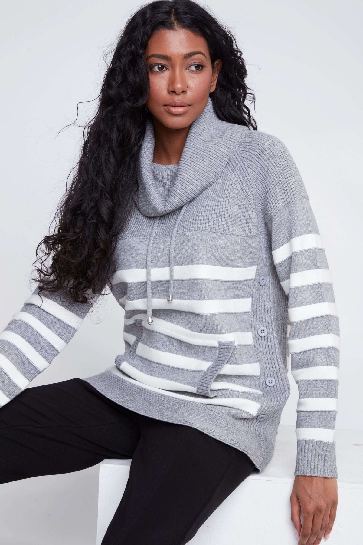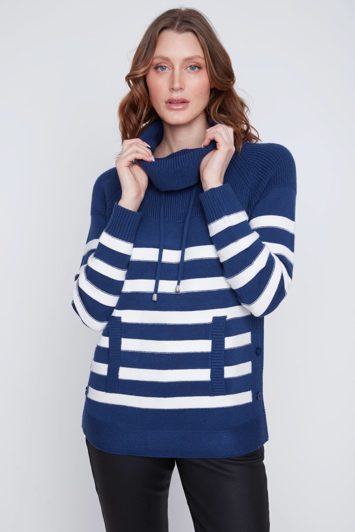 Description: This long-sleeved sweater features a contrasting horizontal stripe pattern for a timeless navy look. Its drawstring-adjustable cowl neck adds a cozy and elegant touch, while the front pocket adds a practical touch. Style tip: wear it with white pants or jeans for a casual chic look.
