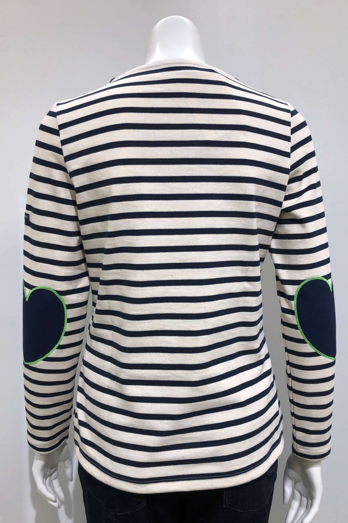 Description: This sailor sweater revisits a classic with a playful, modern twist thanks to its heart-shaped elbow patches. Its straight fit and soft cotton make it a comfortable and trendy piece. Style tip: wear it with raw jeans for a casual look or under a jacket for a more chic look.