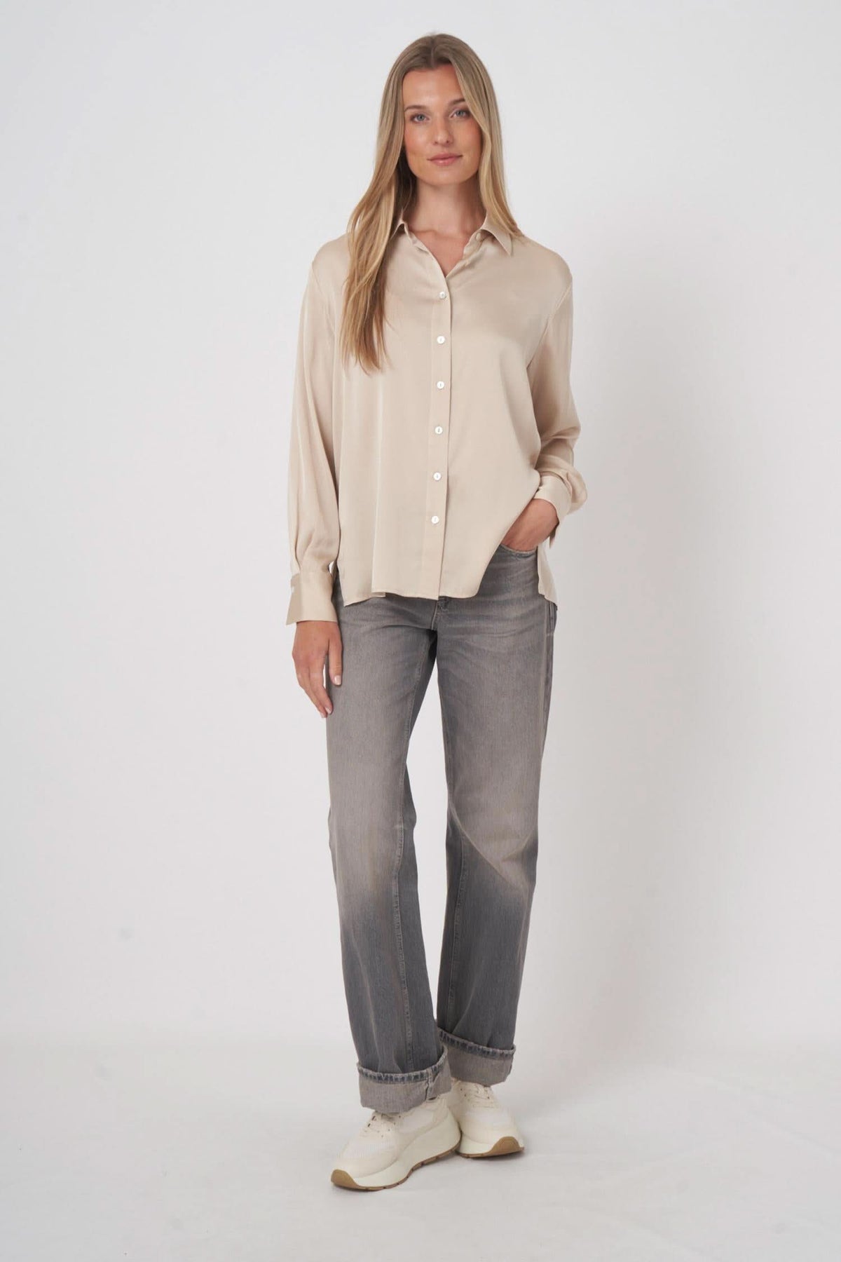 Description: This flowing silk shirt is a tribute to timeless elegance. Its satin texture subtly catches the light, while its straight, supple fit ensures a flawless drape. Thanks to its touch of elastane, it combines refinement and comfort with natural ease. Style tip: slip it into high-waisted jeans or wear it open over a tank top for a chic, casual look.