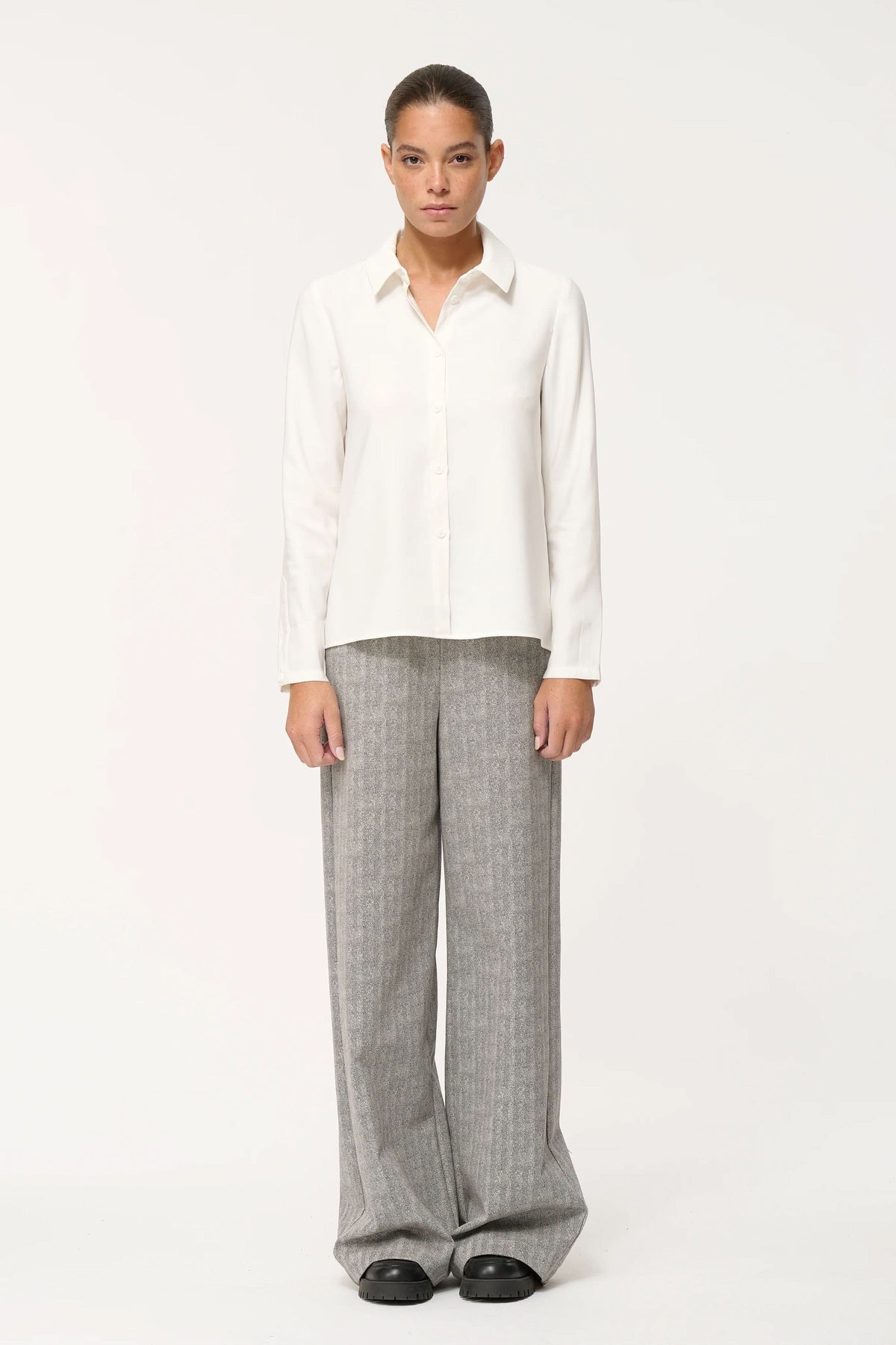 Description: This flowing shirt combines elegance and comfort with its loose fit and natural drape. Its classic collar and button closure make it a versatile piece, perfect for the office or everyday wear. Style tip: wear it over a turtleneck for a refined layered look or on its own with wide-leg pants for a minimalist chic vibe.