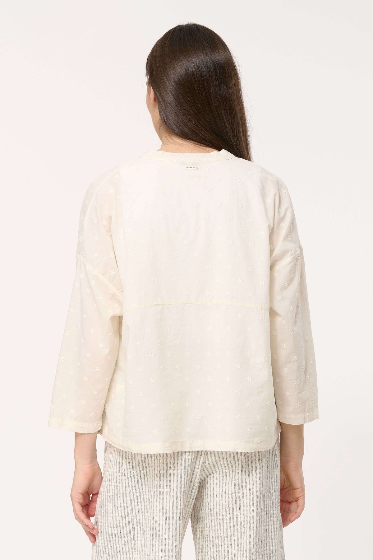 Description: A lightweight embroidered cotton shirt, perfect for a soft yet elegant silhouette. Its minimalist collar and delicate texture add a refined touch to your summer outfits. Wear it with striped pants or linen shorts for a chic and relaxed look.