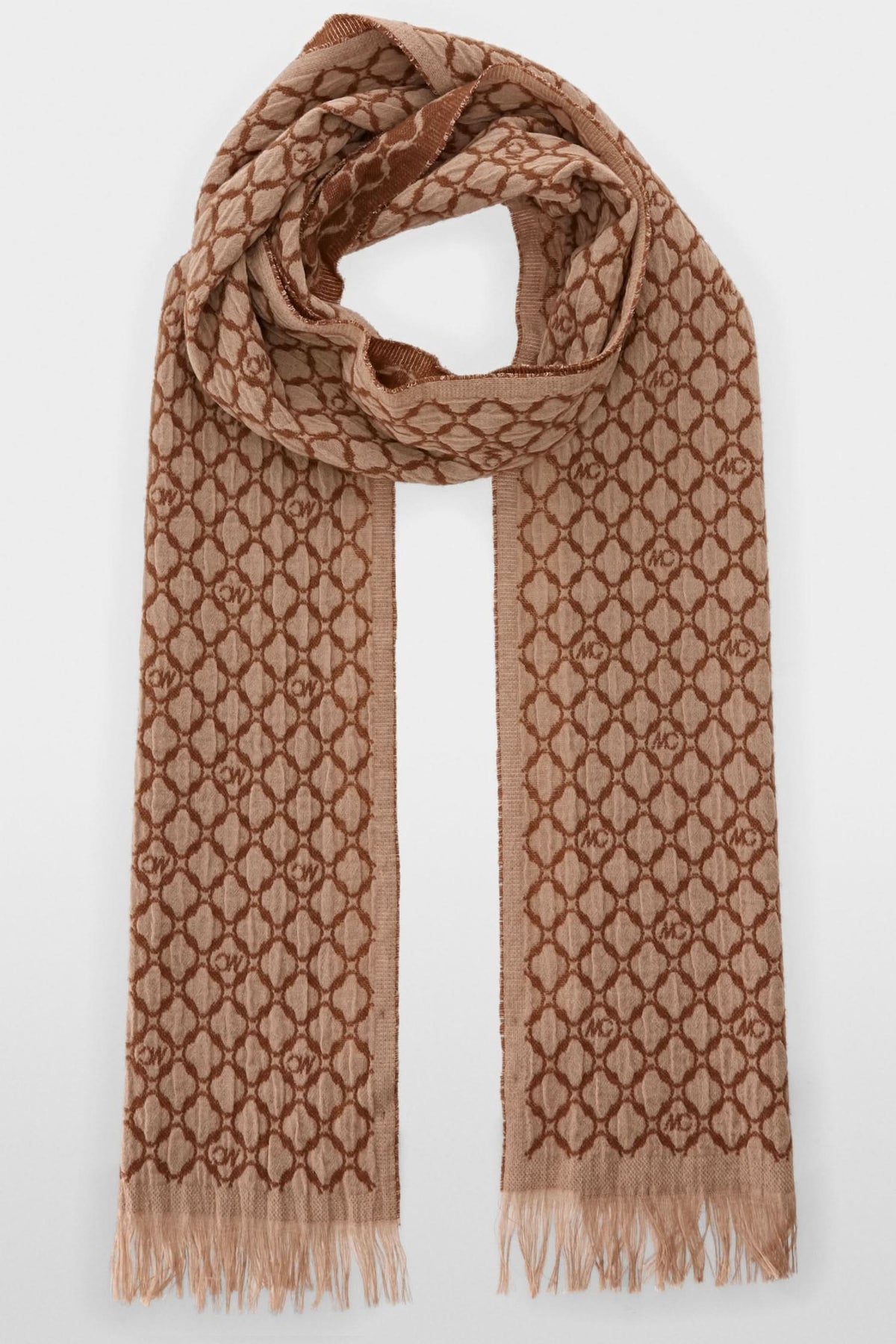 Écharpe en laine bicolore avec franges, portée sur un manteau marron, idéale pour les journées froides.