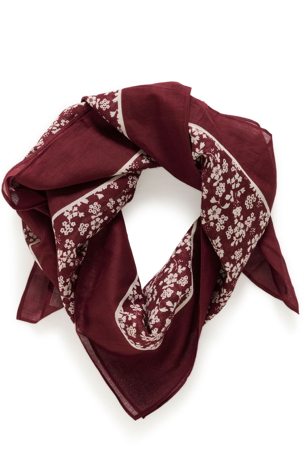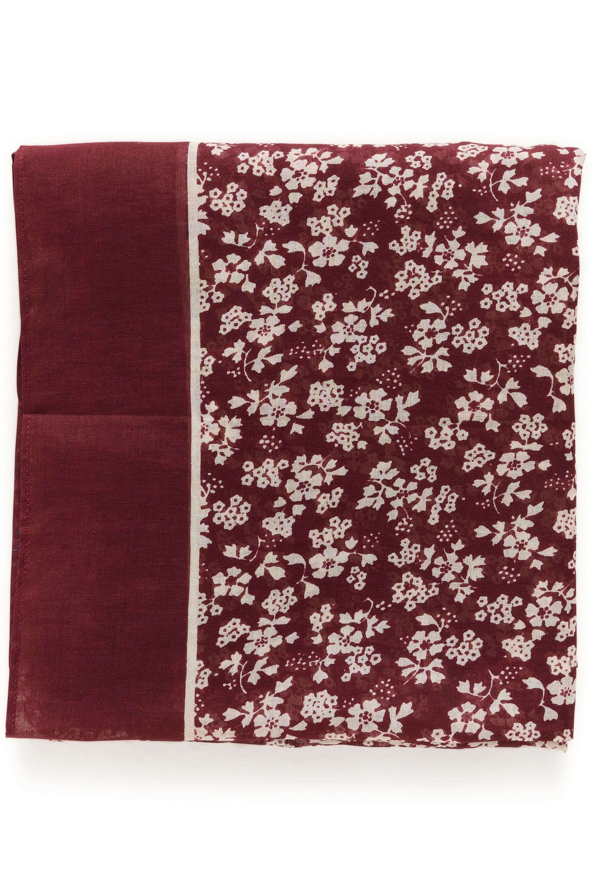 Description: This square scarf stands out with its delicate floral print and deep burgundy tones, enhanced by a contrasting border. Lightweight and flowing, it adds a sophisticated touch to any outfit, whether worn around the neck, in the hair, or tied to a bag.
