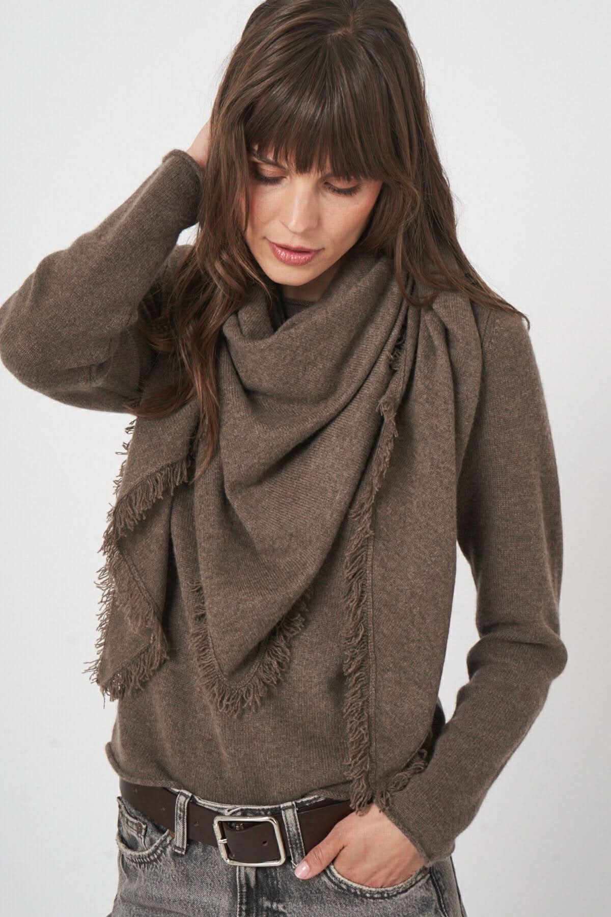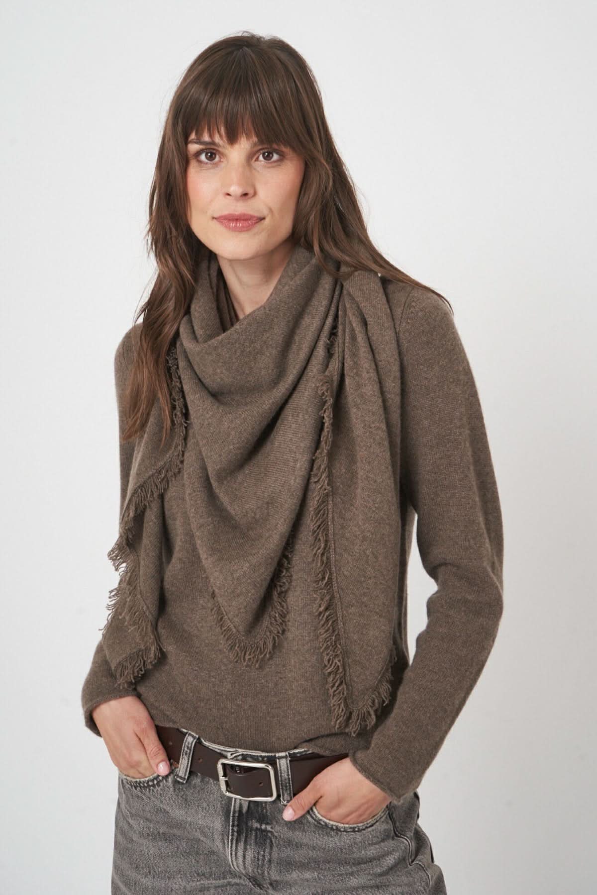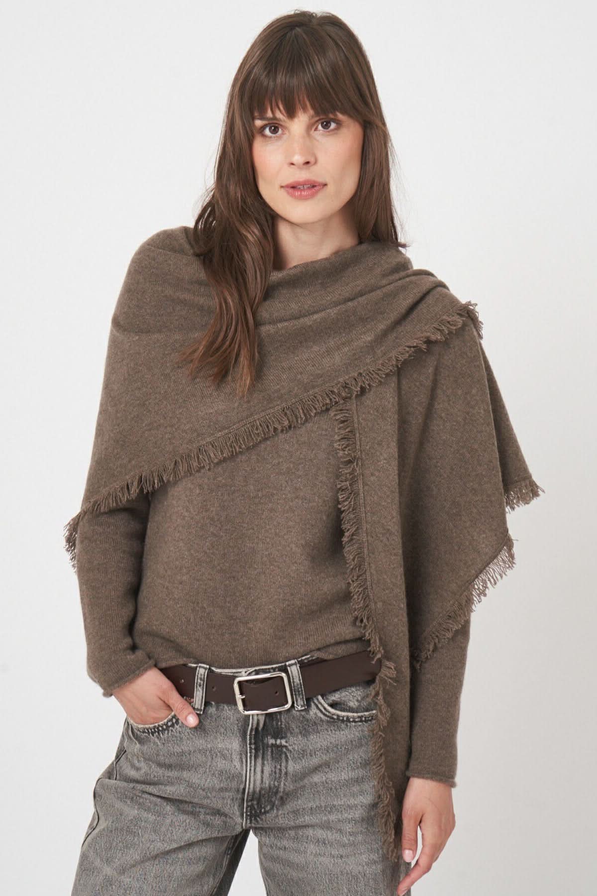 Description: This soft knit scarf with fringed edges combines warmth and casual elegance. Its supple texture and generous size allow it to be worn in multiple ways for a practical yet refined style. Style tip: wrap it loosely around your neck or drape it over your shoulders to complete your fall and winter outfits.