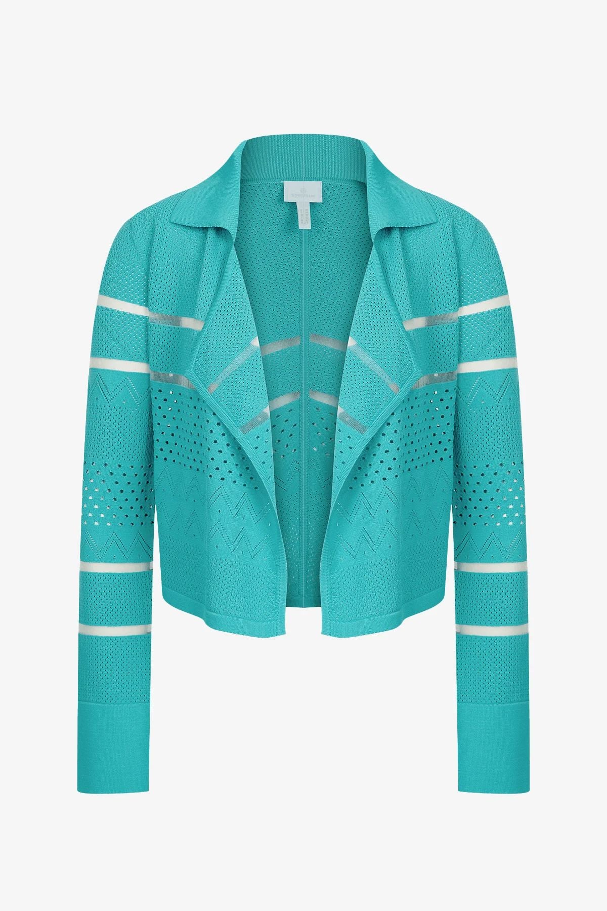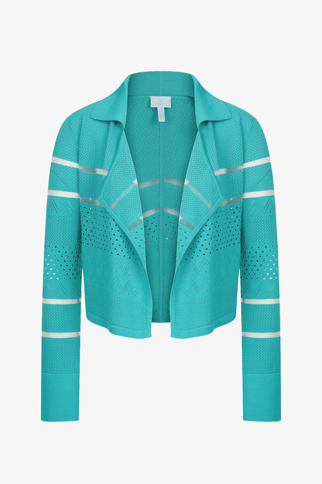 DESCRIPTION : Romantic & casual: the top with collar without closure in pleasant viscose nylon. The airy style is created by the different looped knit patterns and the block-knitted sheer stripes. The jacket is without closure.