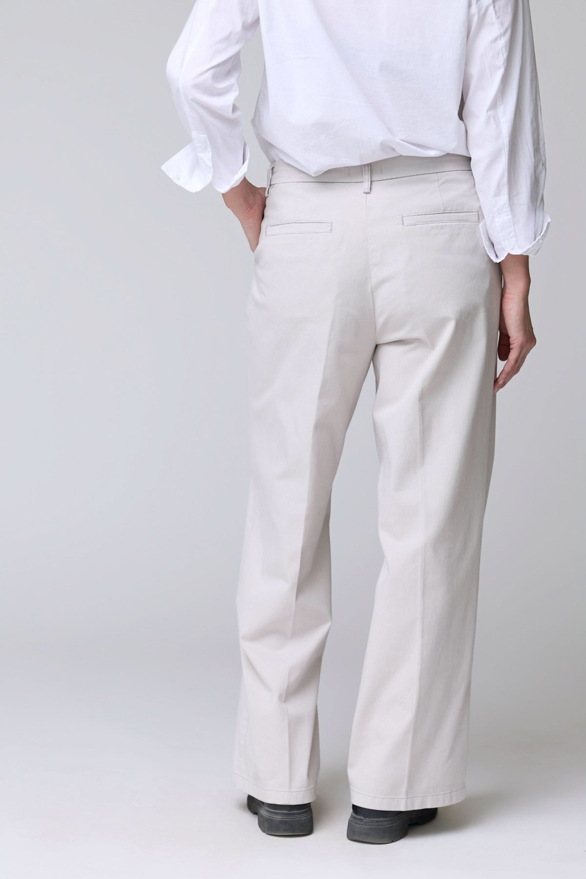 Femme portant un pantalon à jambe large blanc, debout avec une chemise blanche élégante.
