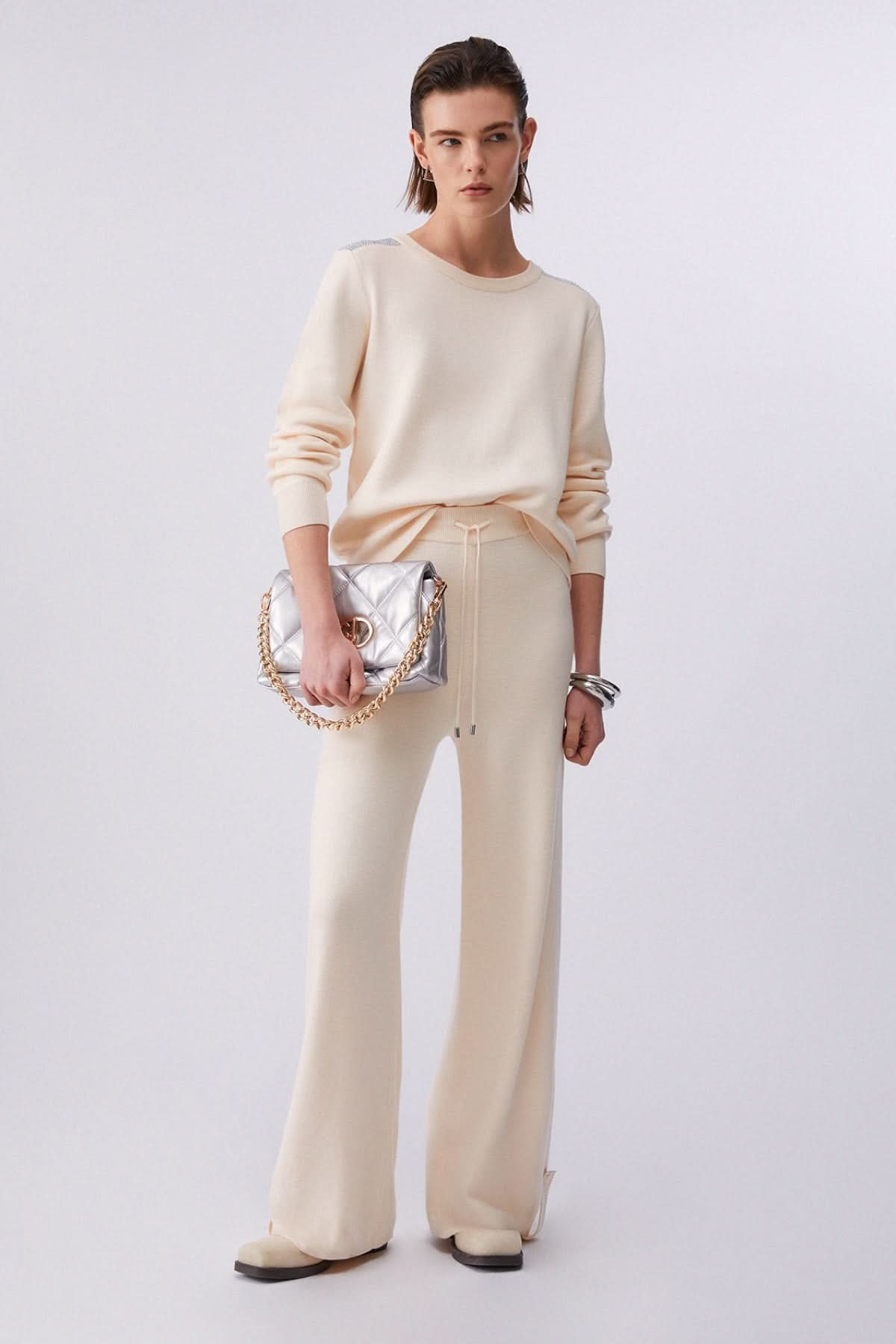 These knit jogging pants offer a modern silhouette with their wide, flowing legs. Their elastic waistband with drawstring ensures optimal comfort throughout the day. Easy to pair, they offer a casual yet elegant look.