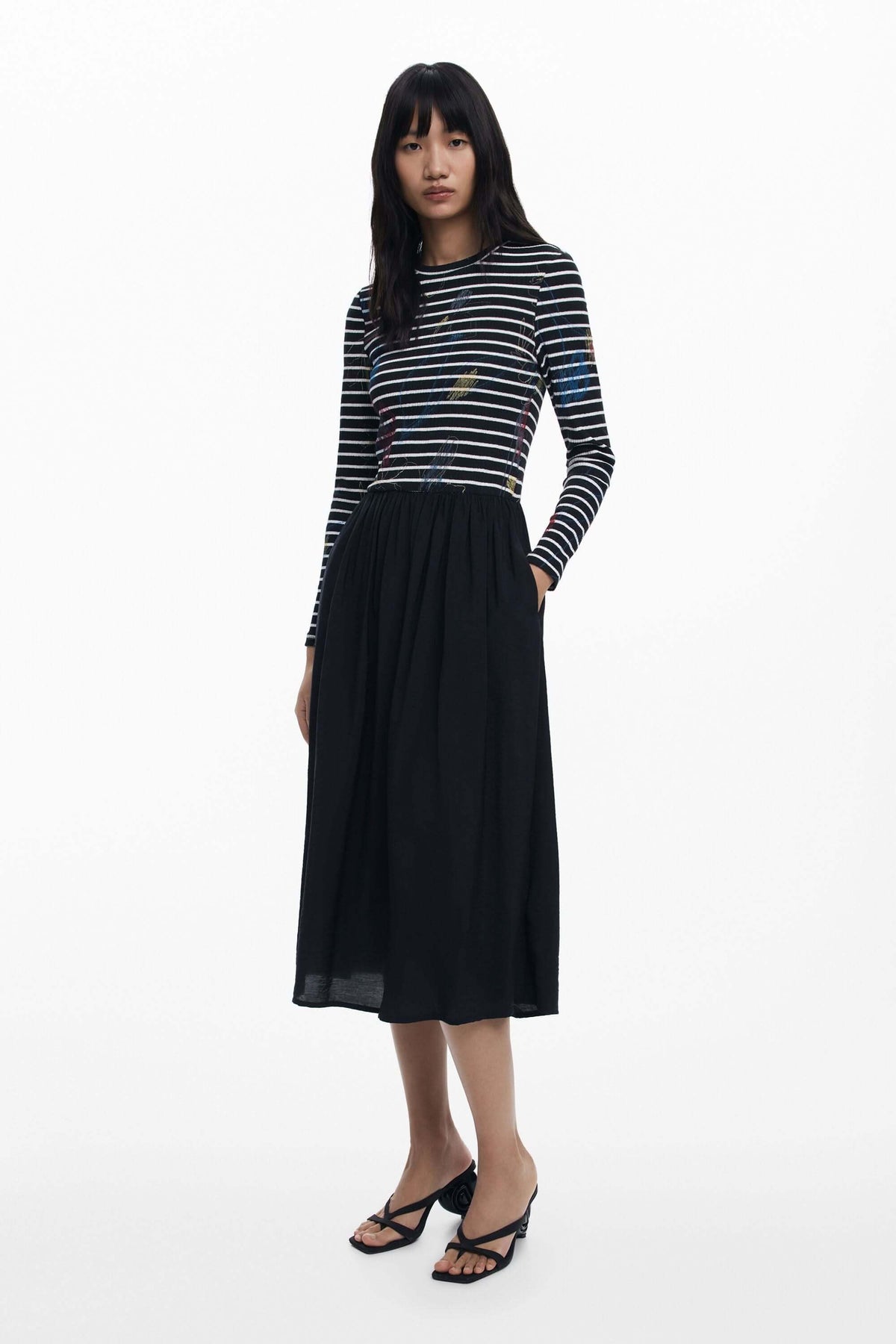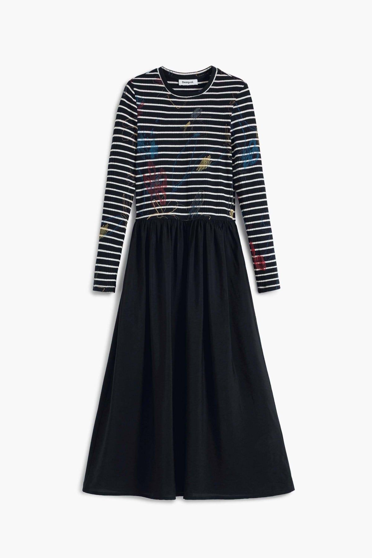 Description: This midi dress combines a striped top with graphic accents and a flowing solid skirt for a stylish, modern contrast. The fitted waist and classic neckline flatter the figure while ensuring optimal comfort. Style tip: Wear with heeled sandals or ankle boots for a look that works for both day and night.
