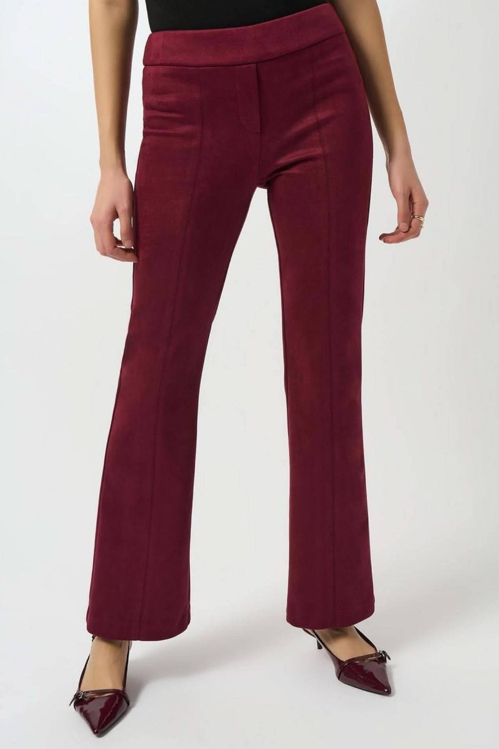 Description: These burgundy straight-leg pants feature a slim fit at the hips and a slight flare at the bottom. The fabric has a suede-like appearance, giving them an elegant look and a soft feel. The waistband is wide and flat, without loops, which accentuates the sleek silhouette of the design. Vertical seams on the front visually lengthen the leg.