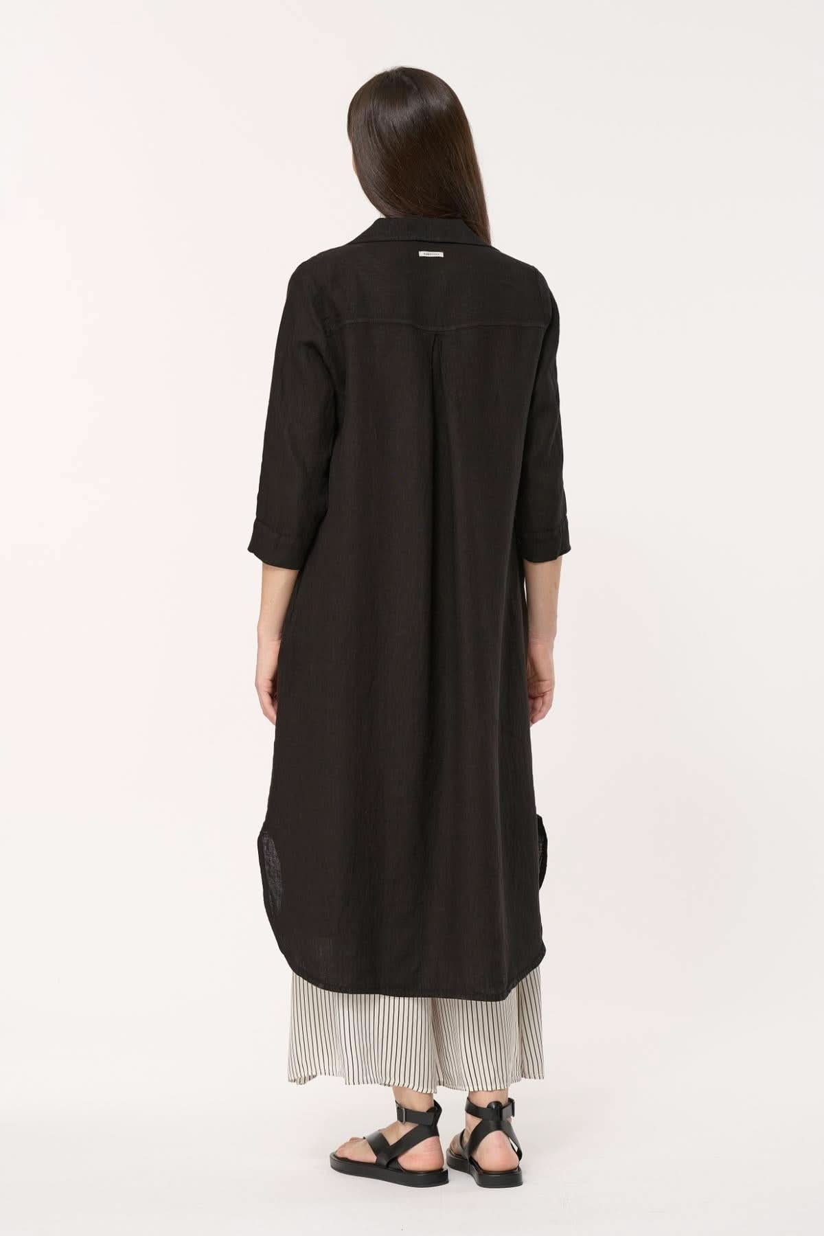 Description: This long linen shirt dress combines elegance and comfort with its flowing cut and breathable fabric. Its classic shirt collar and button closure give it a timeless touch. Ideal for a versatile look, it can be worn open or closed.