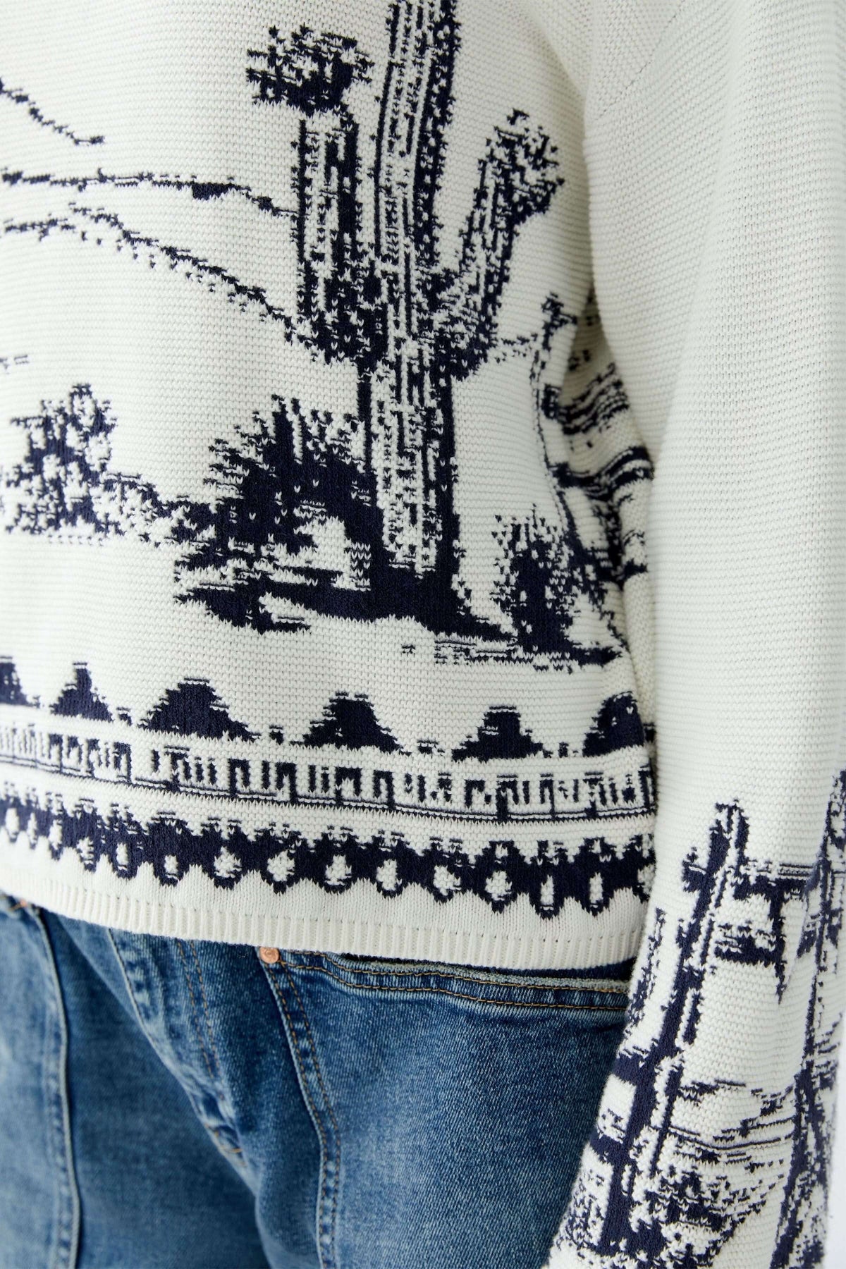 Description: This round-neck knit stands out for its contrasting desert landscape pattern, which adds an artistic and original touch. Its relaxed fit and soft knit make it a comfortable and unique piece to add to your wardrobe. Style tip: pair it with straight-leg jeans or flowing pants to highlight its graphic design.
