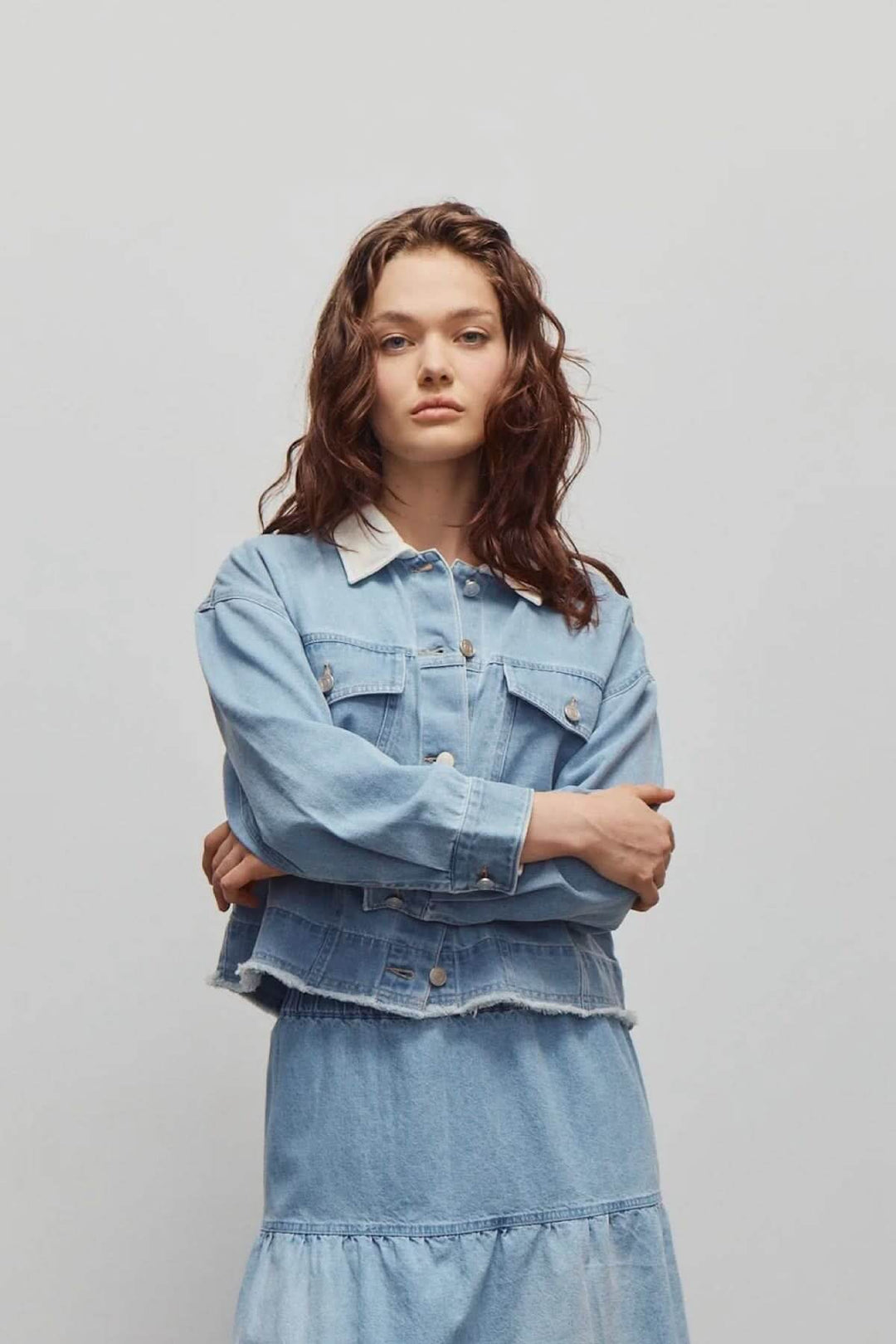 This denim jacket offers a modern, relaxed silhouette that is ideal for completing an everyday outfit. Its short length and frayed hem add a contemporary, trendy touch. Easy to layer, it pairs equally well with a dress or pants for a versatile style.