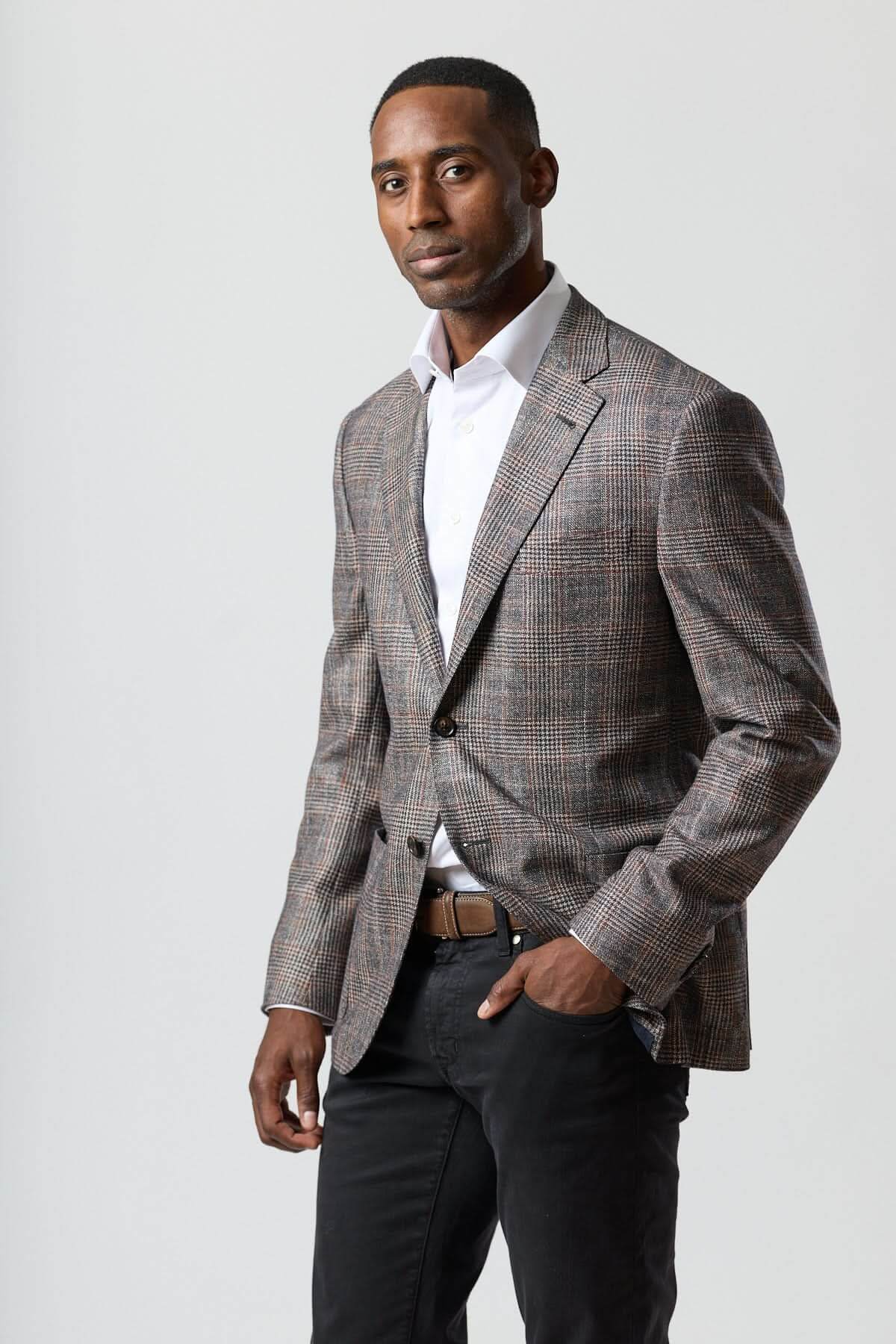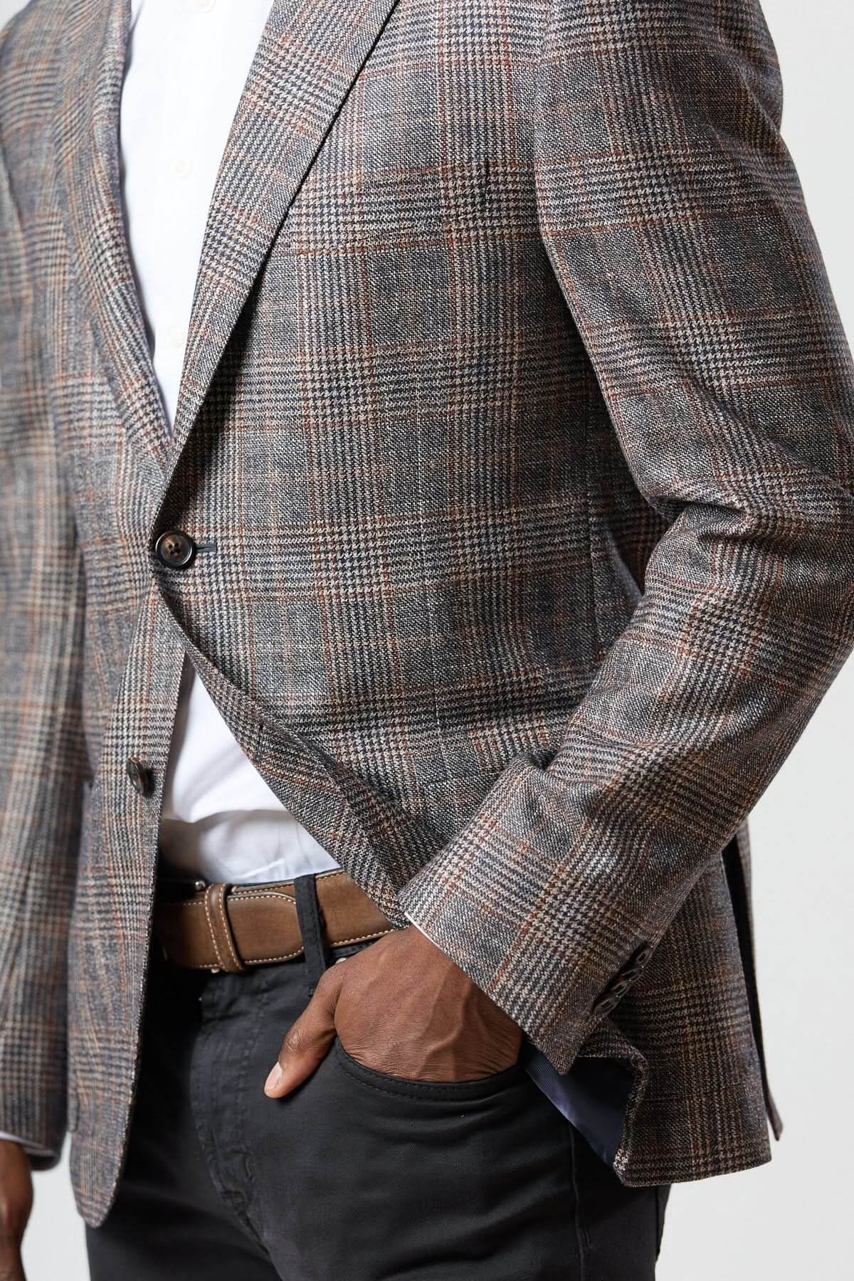 Description: This Corneliani blazer embodies Italian elegance with a refined check pattern in warm shades of brown, gray, and camel. Crafted from a luxurious blend of wool, silk, and cashmere, it captivates with its soft texture and natural lightness. Its semi-fitted cut and supple weave offer a fluid drape, perfect for a sophisticated look for everyday wear or formal occasions.
