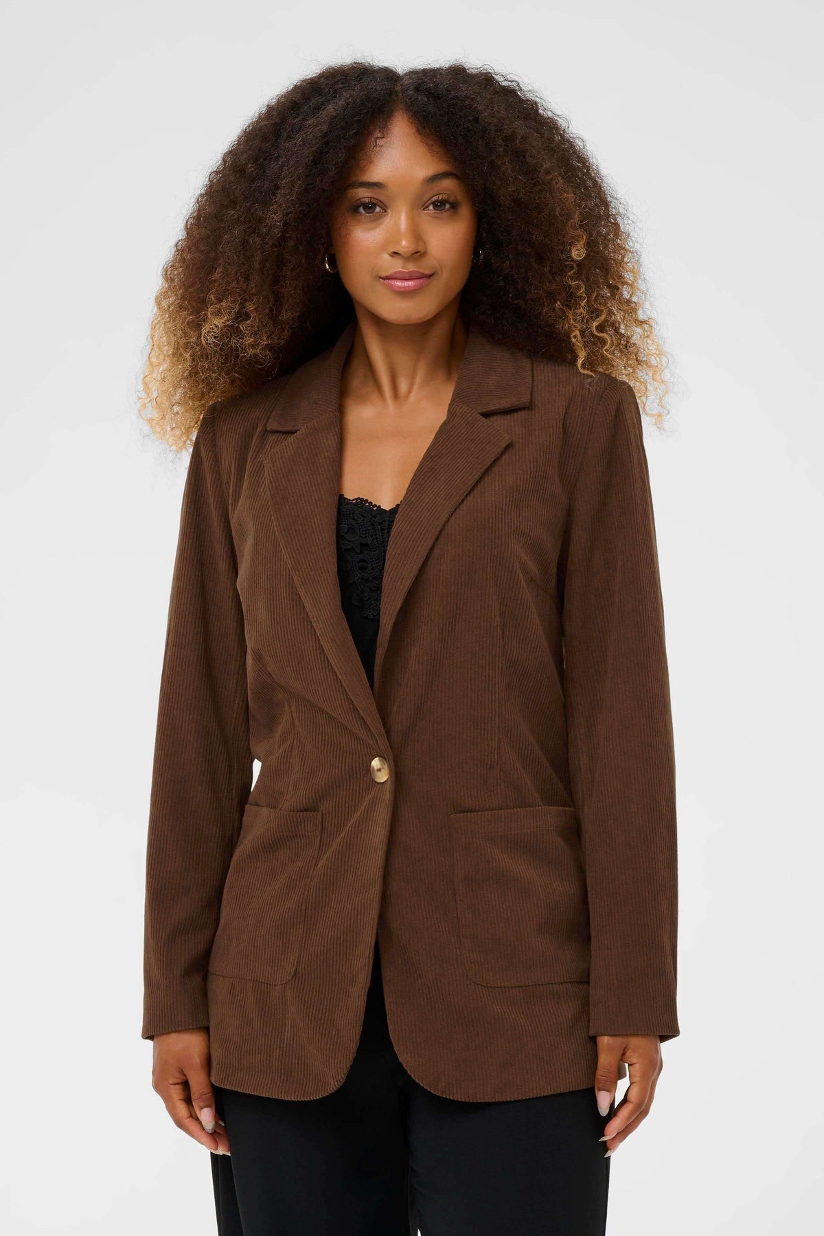Veston Kanna en velours côtelé à bouton unique, offrant élégance décontractée et confort avec texture douce et tombé fluide.