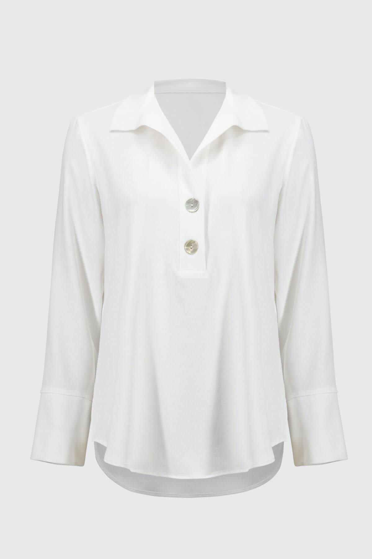 Description : Blouse légère souple au fini soyeux, col classique encolure en V avec une fermeture boutonnée, manches longues avec revers, sa longueur aux hanches et sa finition arrondie ajoute une touche d'élégance au style raffiné.