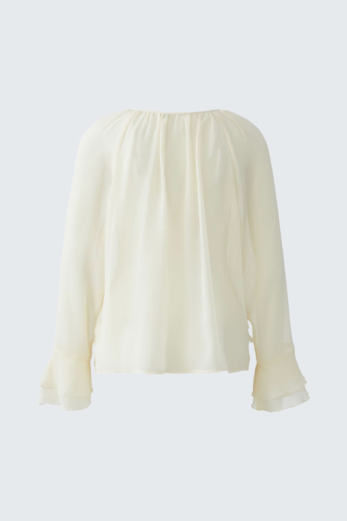 Gros plan de blouse fluide à volants et lien au col, tissu léger et transparent. Décris moi le produit en français.
