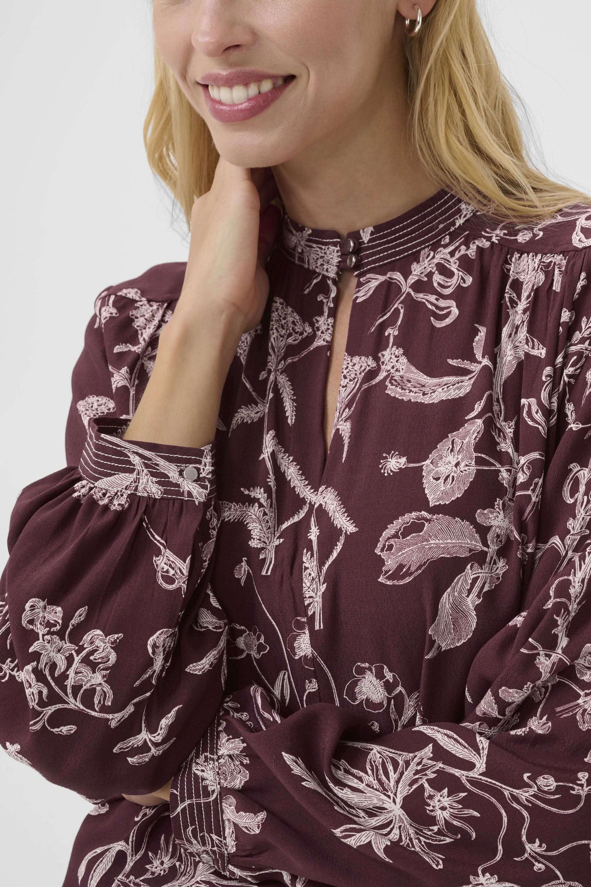 Description: Cette blouse à motif floral se distingue par son col montant délicat et sa goutte d’eau boutonnée à l’encolure. Ses fronces légères aux épaules ajoutent du volume et de la fluidité à la silhouette. Idéale pour apporter une touche élégante et féminine à vos tenues du quotidien.