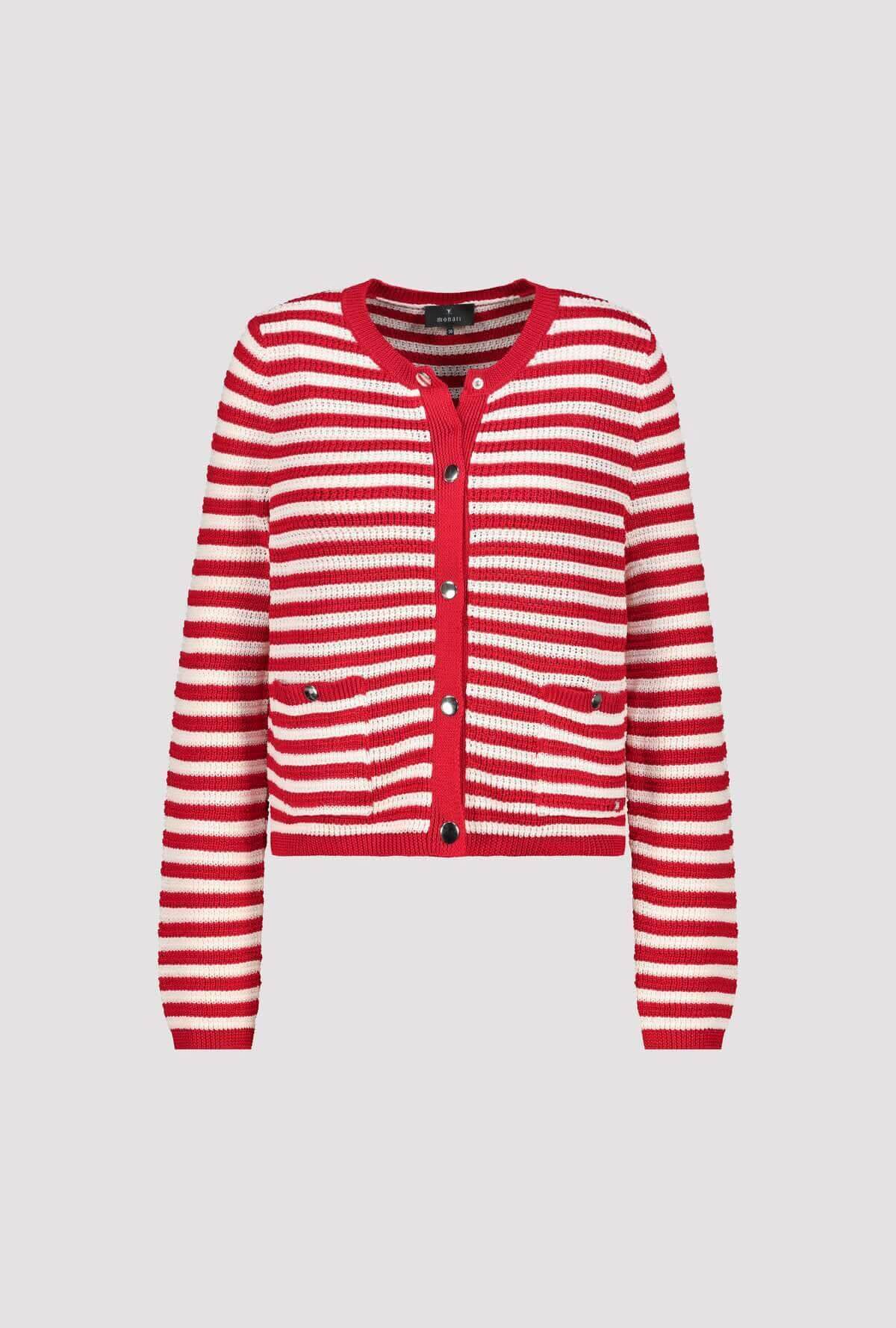 Cardigan rayé boutonné rouge et blanc avec coupe droite et encolure arrondie, détails de boutons apparents.