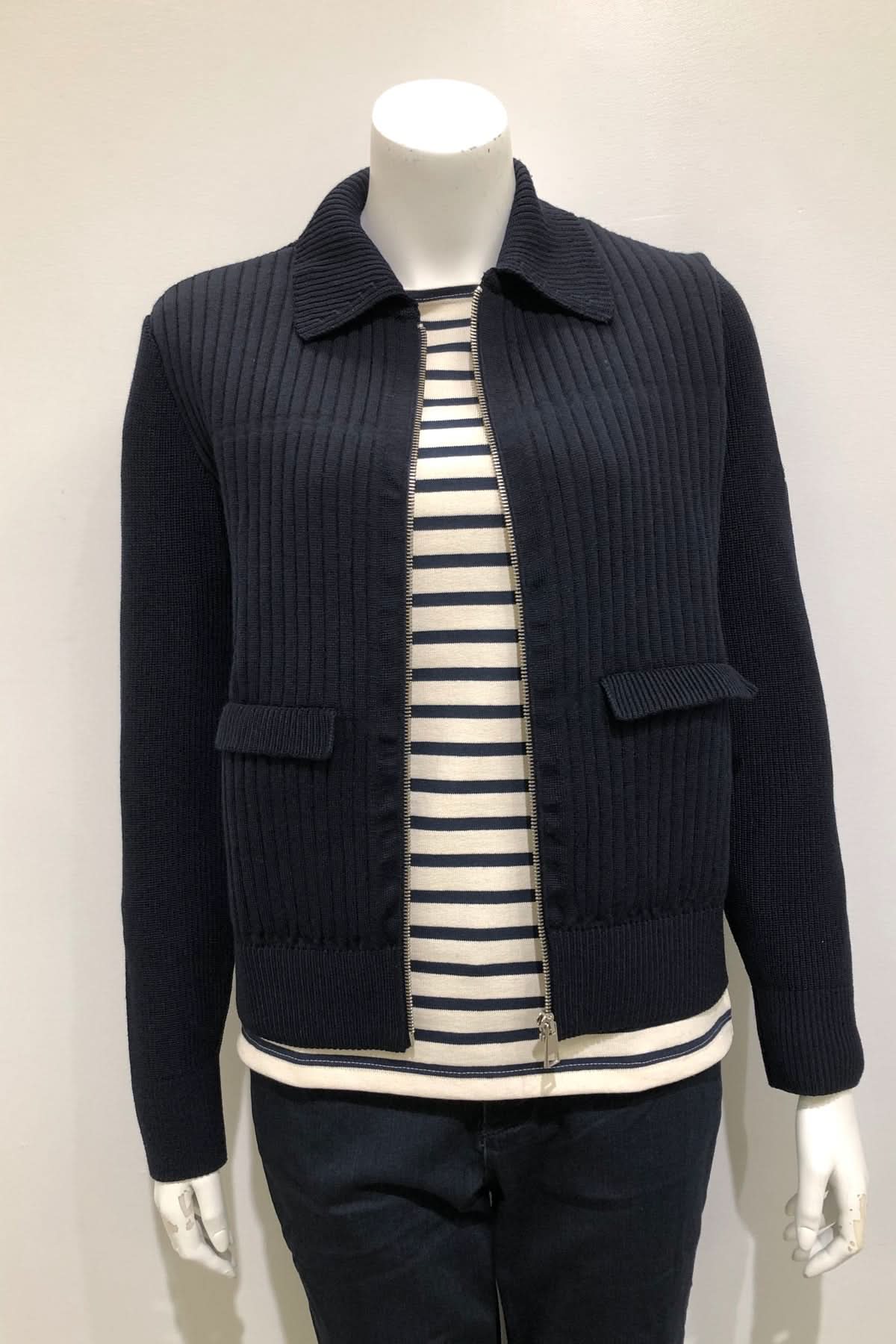 Description : Cardigan zippé en maille structurée de couleur marine. Elle présente un col chemise classique, une texture côtelée verticale sur l’avant et un design sobre et élégant. Le modèle est porté avec un t-shirt rayé marine et crème en dessous, ajoutant une touche marine chic.