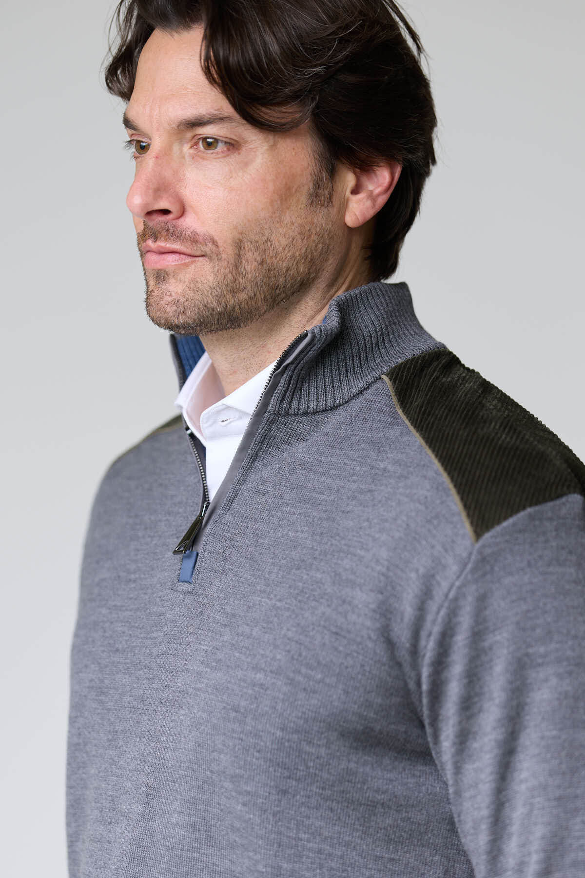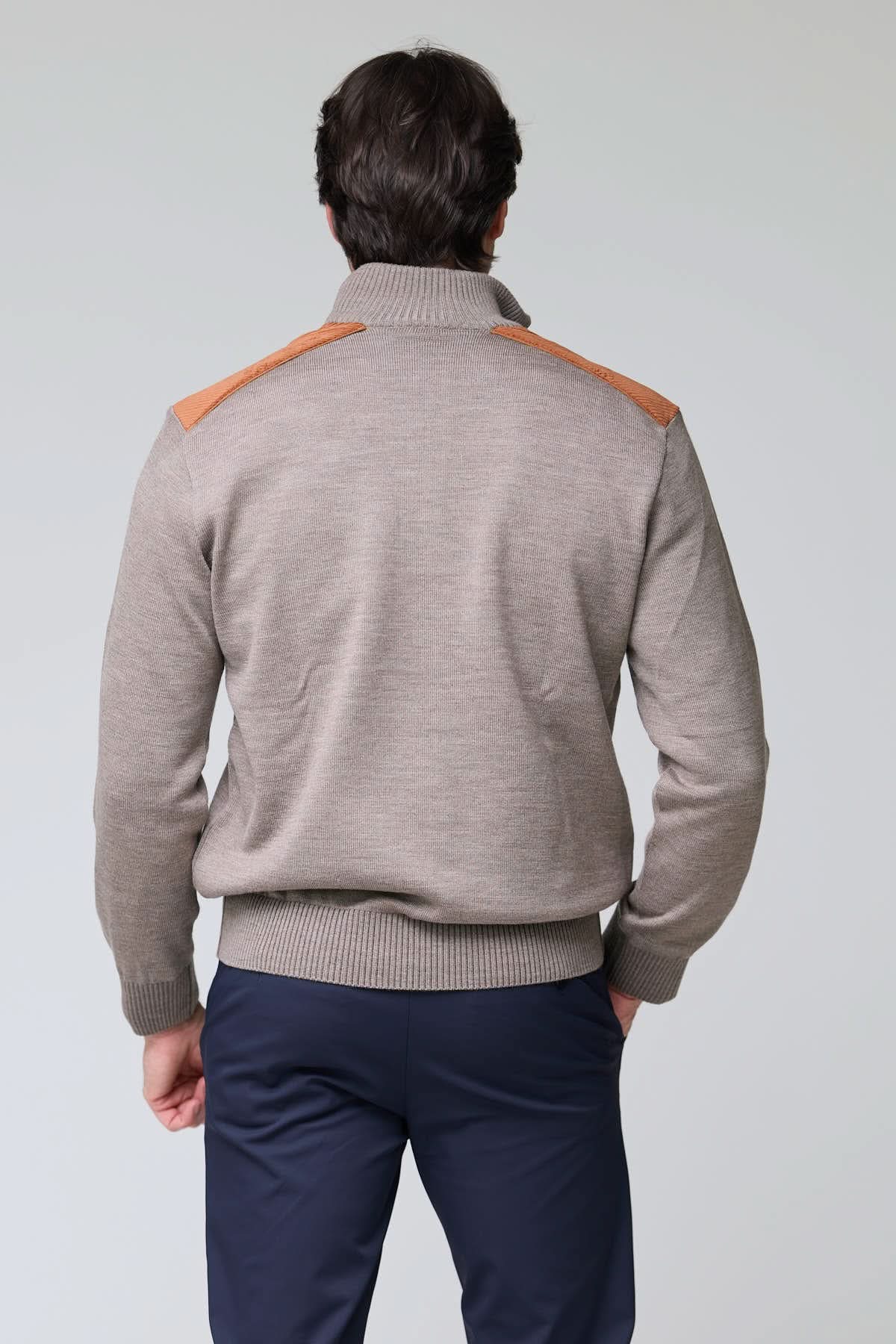 Homme portant un chandail à col demi-glissière avec empiècements en maille grise, empiècements en velours côtelé sur les épaules, look décontracté.