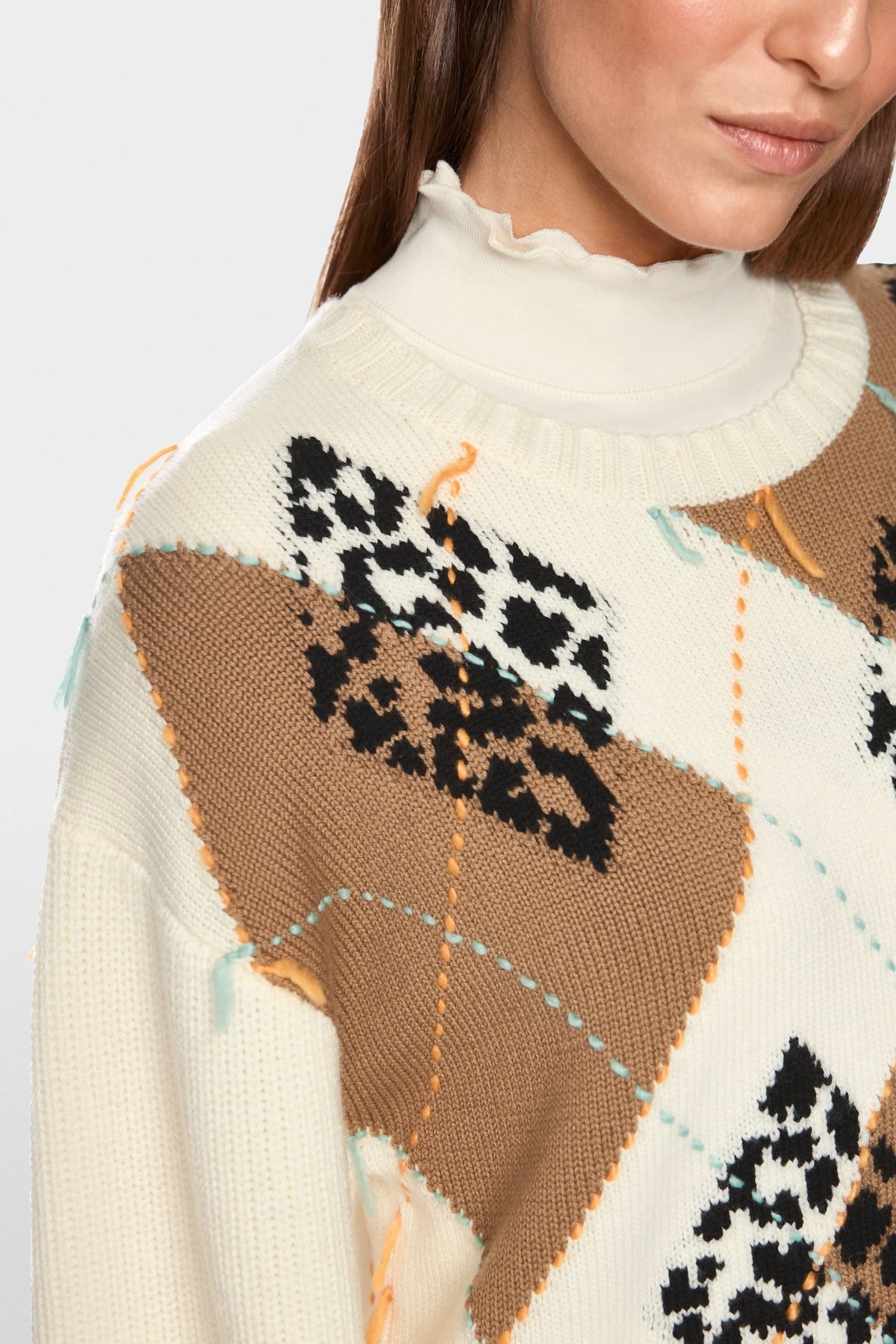 Chandail à motif losanges et accents léopard en mailles texturées avec détails modernes pour une élégance décontractée en saison froide.