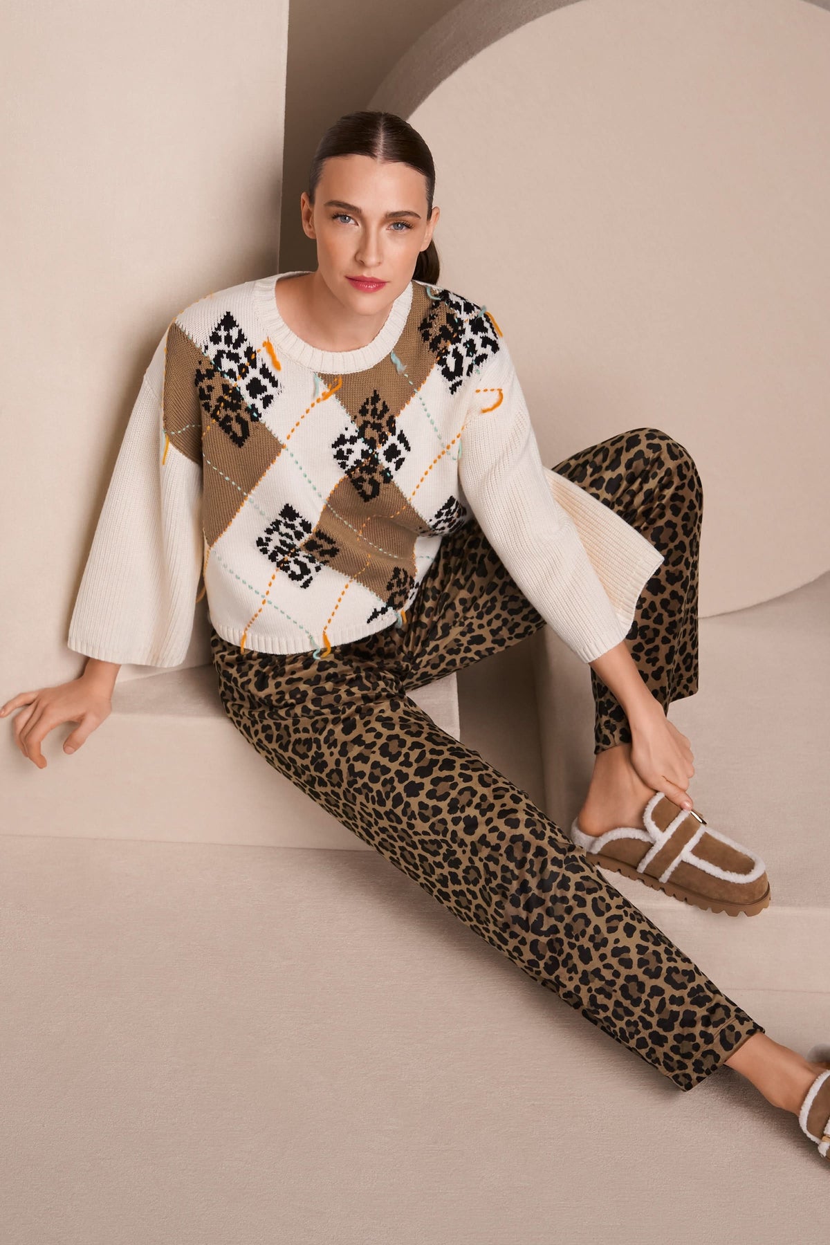 Femme portant un chandail à motif losanges et accents léopard avec un pantalon léopard, style moderne et confortable.