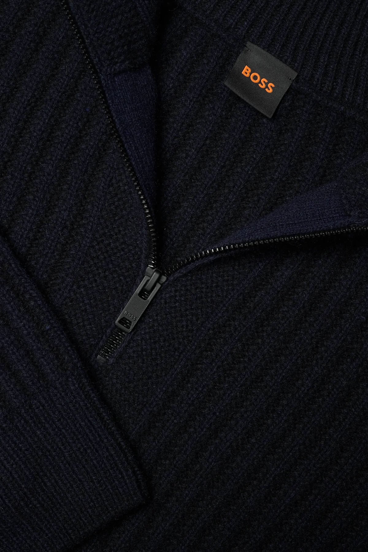 Detail of a ribbed knit, half-zip sweater with a dark color and a branded label. Chandail en tricot à demi-glissière.
