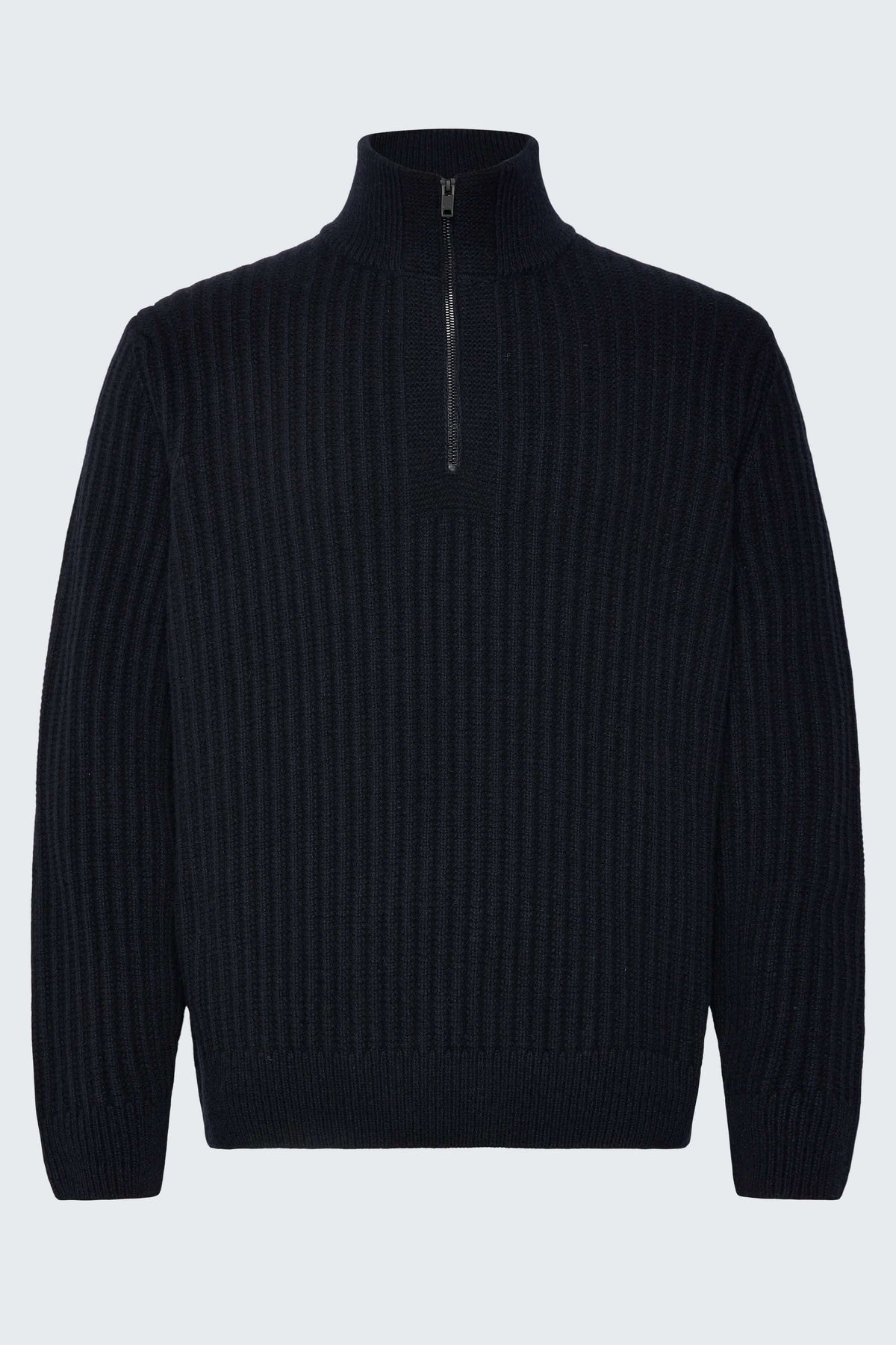 Homme portant un chandail en tricot à demi-glissière avec col montant zippé et design côtelé, idéal pour un style décontracté et soigné.