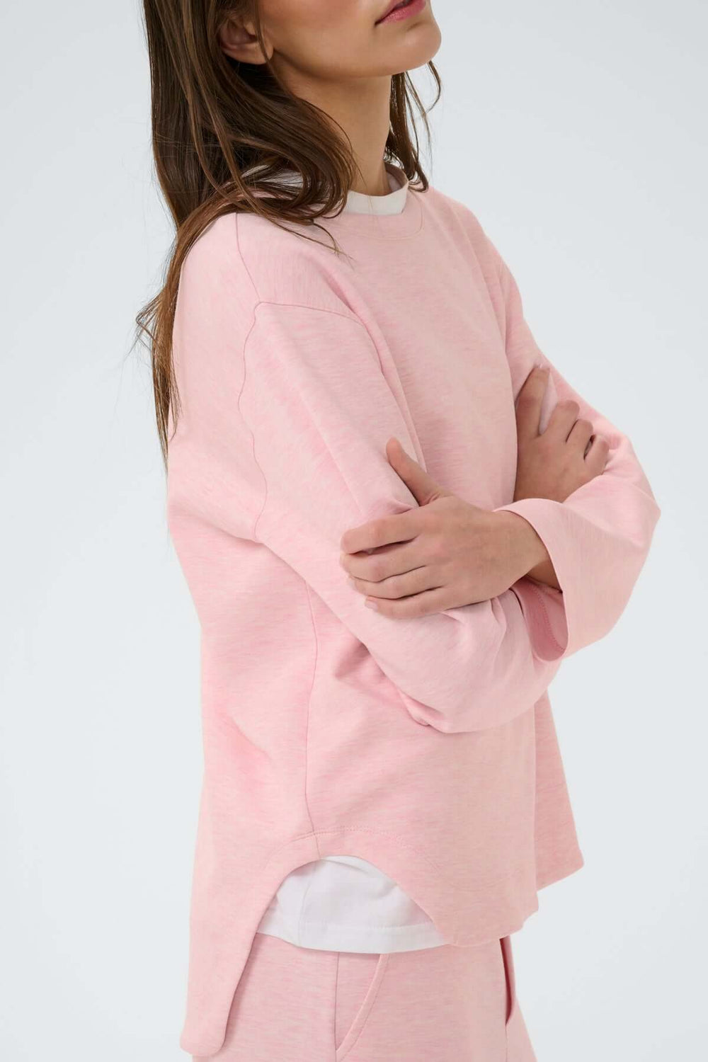Chandail Gincent rose à manches longues et encolure arrondie, parfait pour un look décontracté et confortable au quotidien.