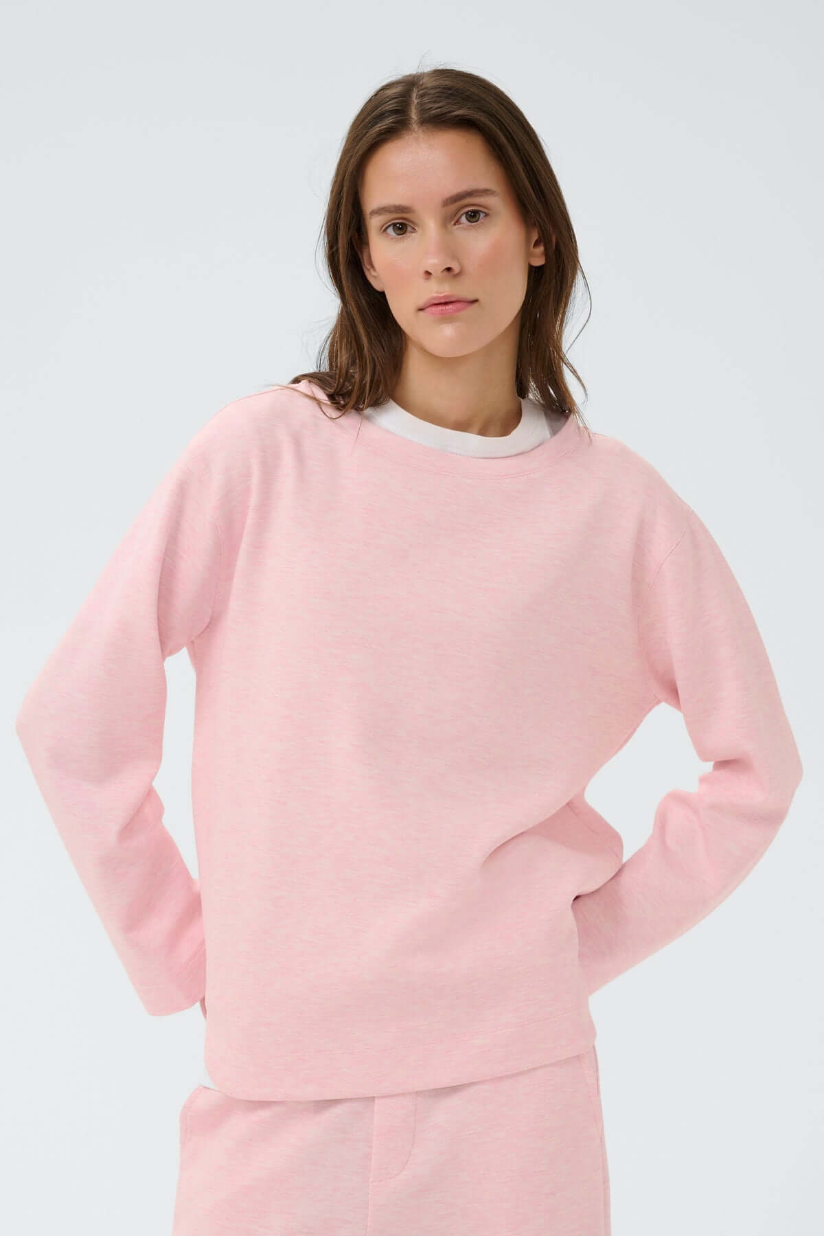 Chandail Gincent à manches longues coupe droite en rose, style minimaliste et décontracté, tissu doux avec encolure arrondie.