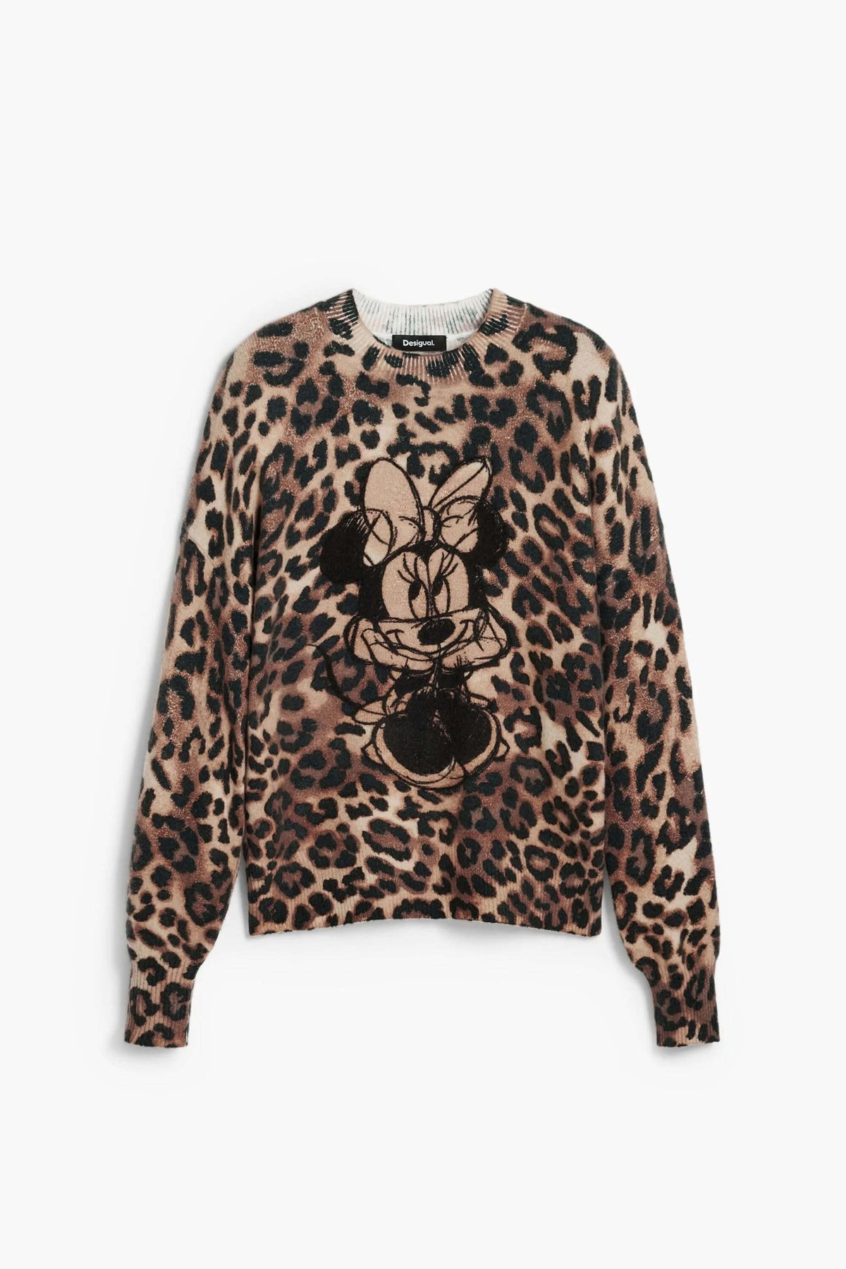 Description : Ce chandail à col rond mise sur un imprimé animalier audacieux rehaussé d’un portrait stylisé de Minnie Mouse au centre. Sa coupe droite et sa maille douce offrent un confort absolu tout en affirmant une touche ludique et tendance. Conseil style : portez-le avec un jean ou une jupe minimaliste pour laisser l’imprimé s’exprimer pleinement.