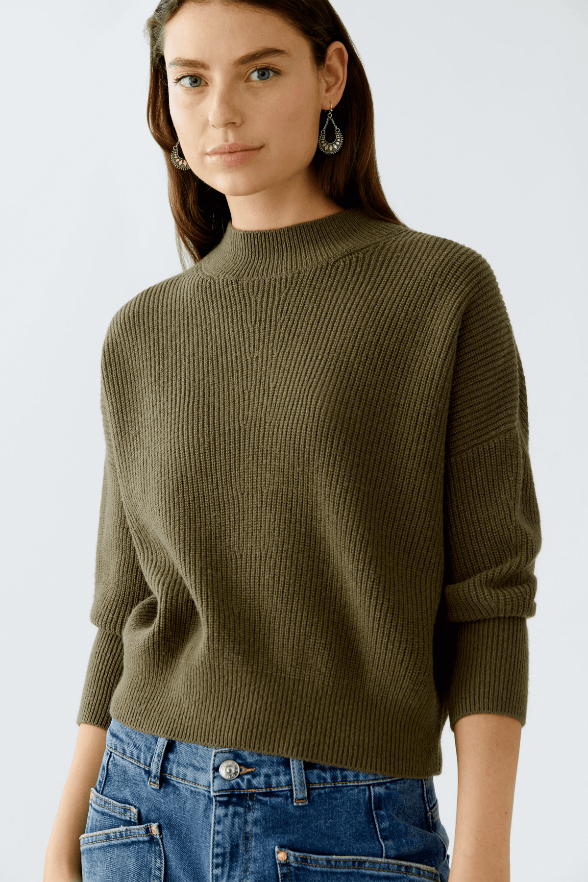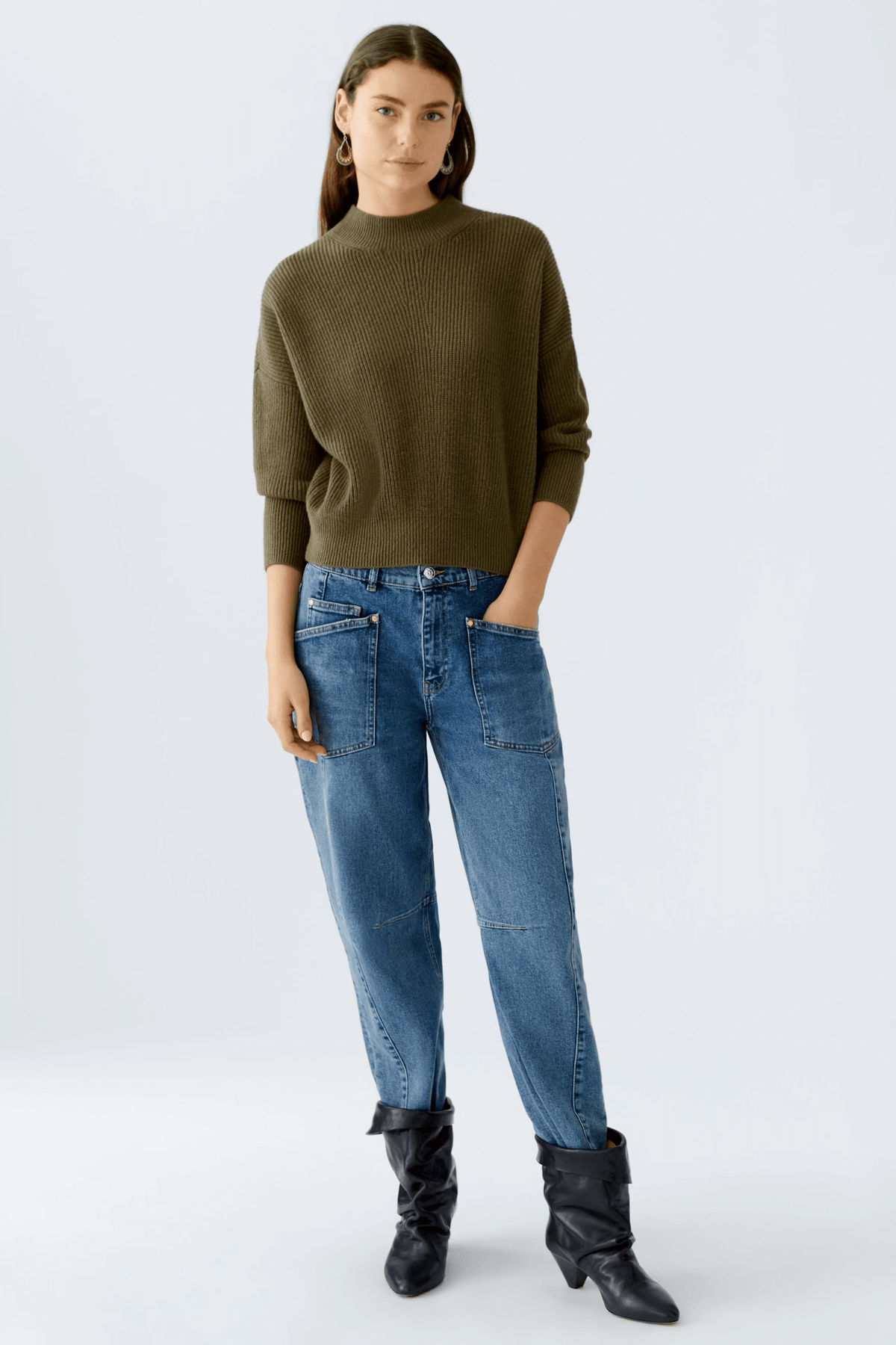 Description: Ce chandail en maille fine à col montant incarne l’élégance minimaliste. Sa coupe légèrement ample et ses finitions côtelées offrent un confort moderne et une allure sophistiquée. Conseil style : portez-le rentré dans une jupe à motifs ou un pantalon habillé pour un look chic et intemporel.