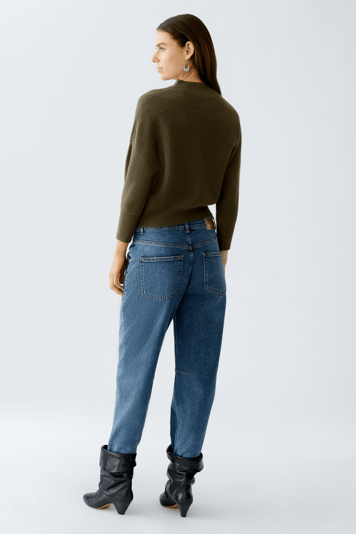 Femme de dos portant un chandail en maille fine et une jupe à motifs, avec des bottes noires élégantes.