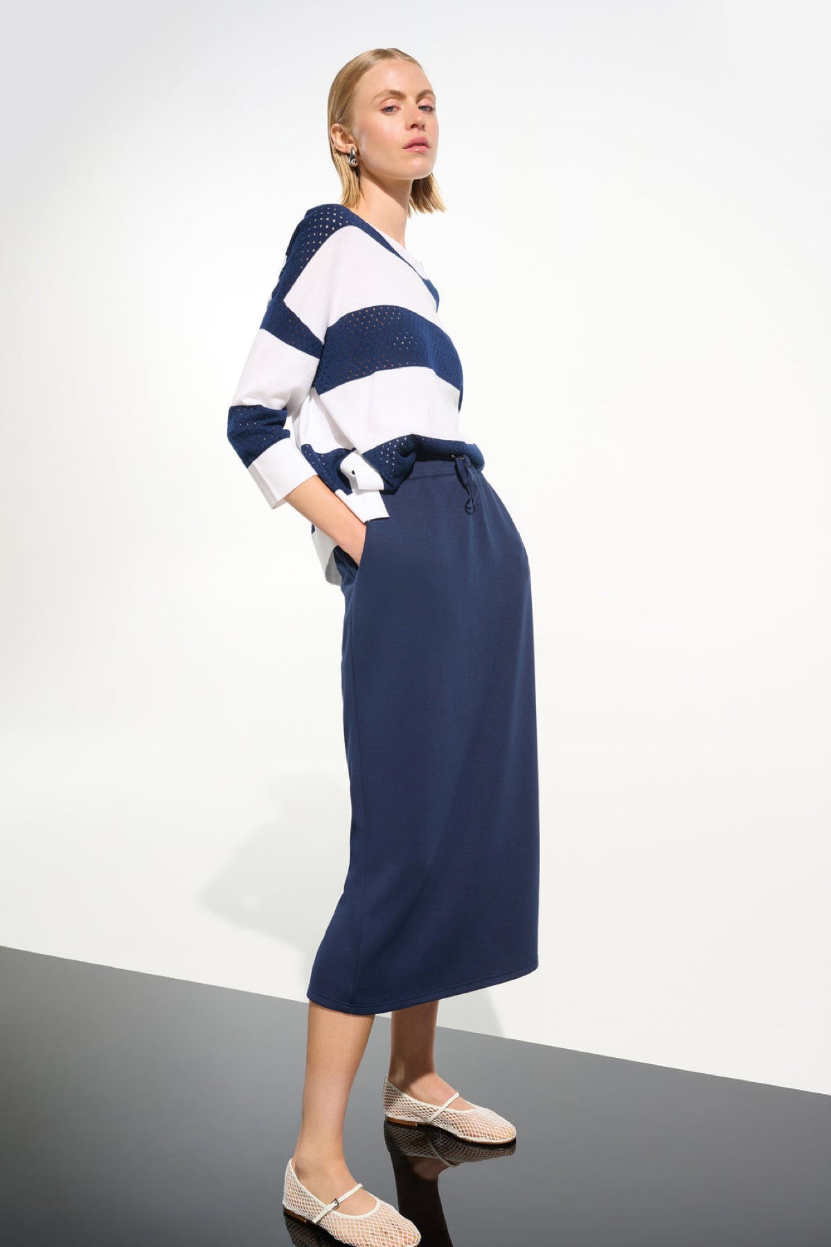 Description : Chandail léger à rayures larges, confectionné dans une maille ajourée qui laisse subtilement passer la lumière pour un effet de transparence raffiné. Sa coupe ample et son encolure ronde offrent un tombé décontracté et élégant, idéal pour les superpositions de mi-saison. Se porte aisément avec un pantalon fluide ou une jupe droite pour un look chic et confortable.