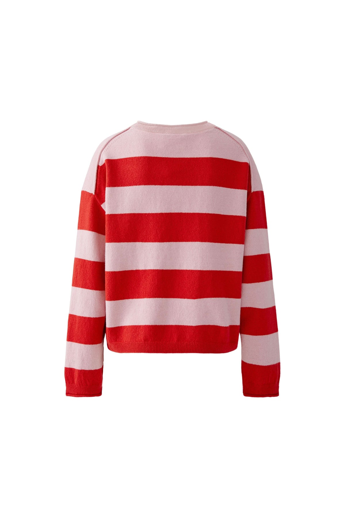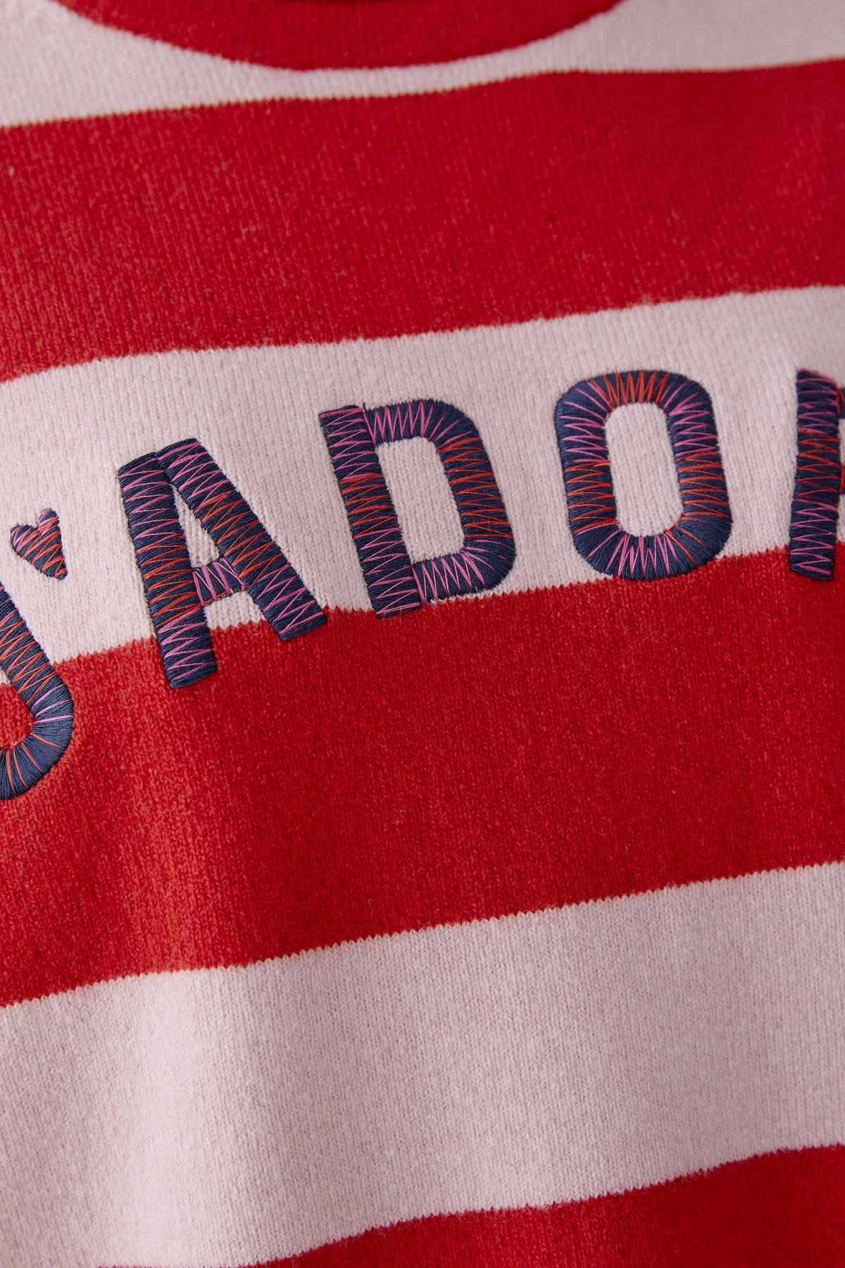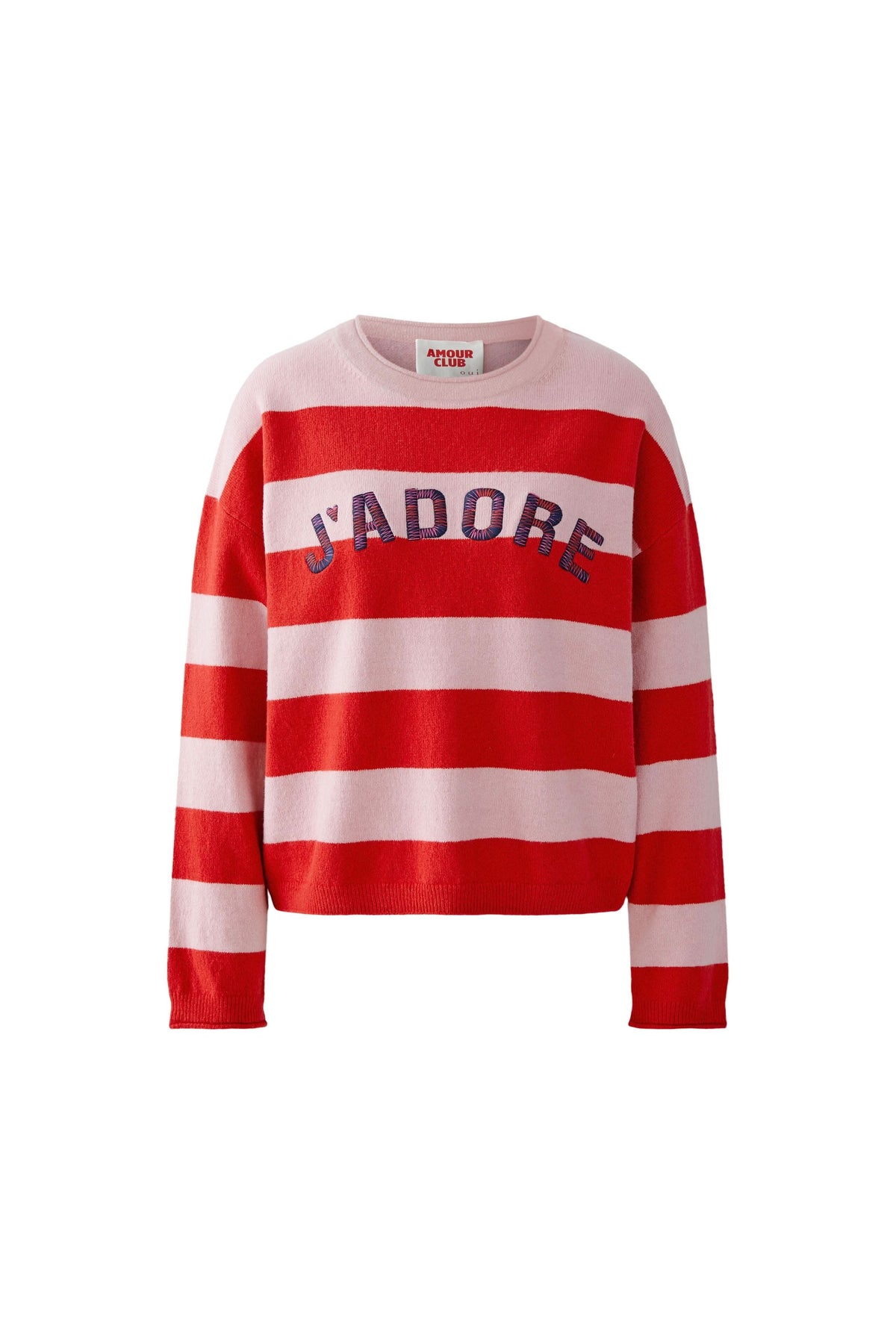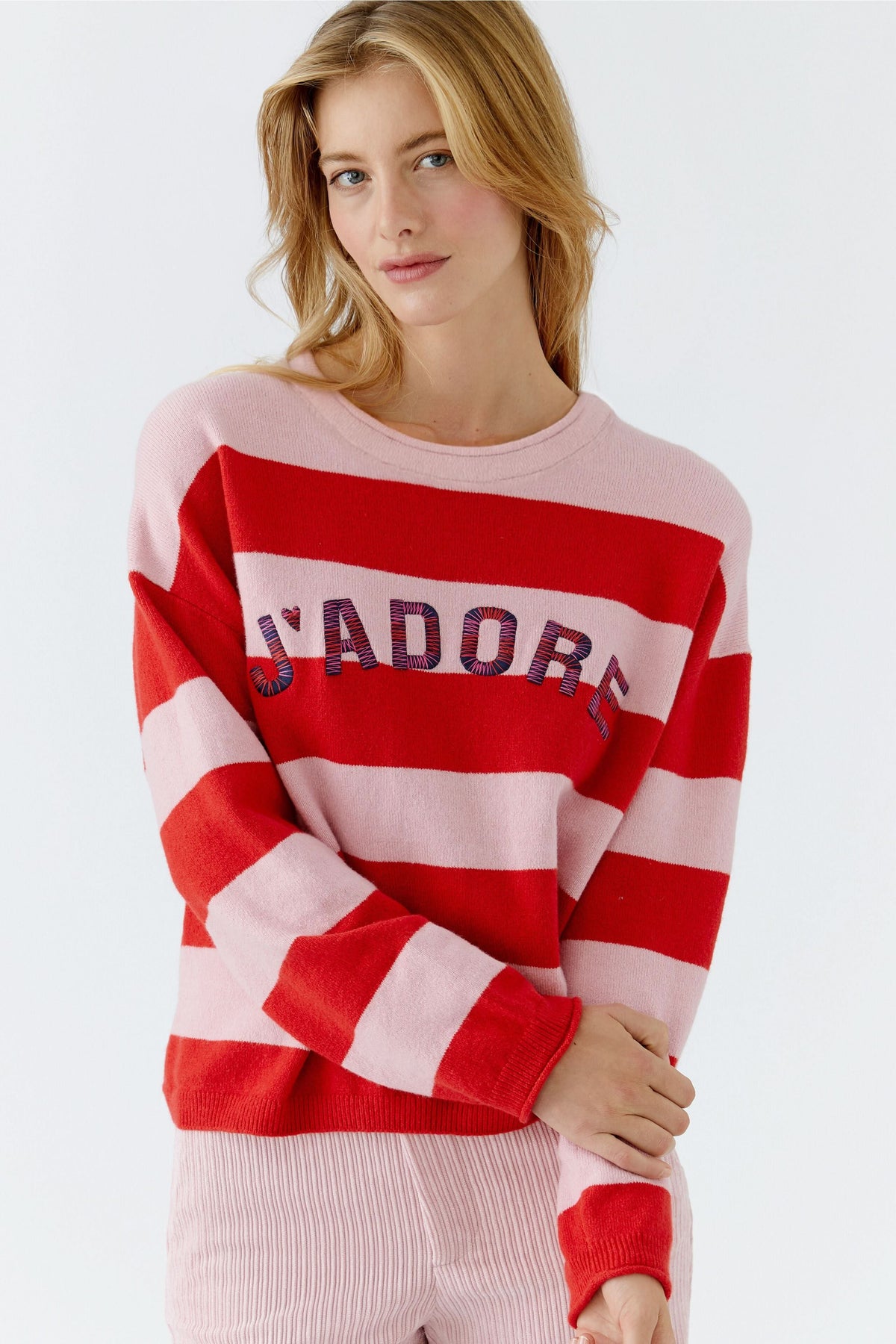Ce chandail rayé apporte une touche ludique et féminine à la garde-robe grâce à son motif graphique et son message brodé « J’adore » à l’avant. Sa coupe confortable et son tricot doux en font une pièce idéale pour le quotidien, facile à porter autant avec un jean qu’avec un pantalon plus habillé pour un look décontracté chic.