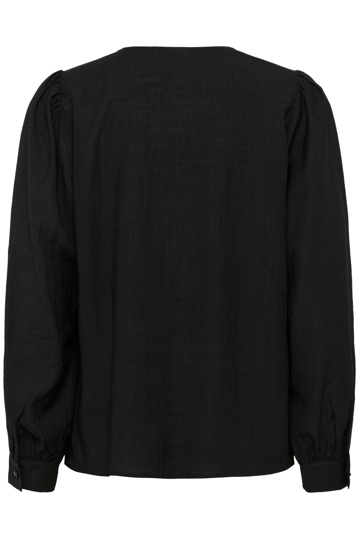 Model wearing Chemise Mirabel à col V et détails de dentelle, showcasing V-neck with lace trim and long puff sleeves in black.