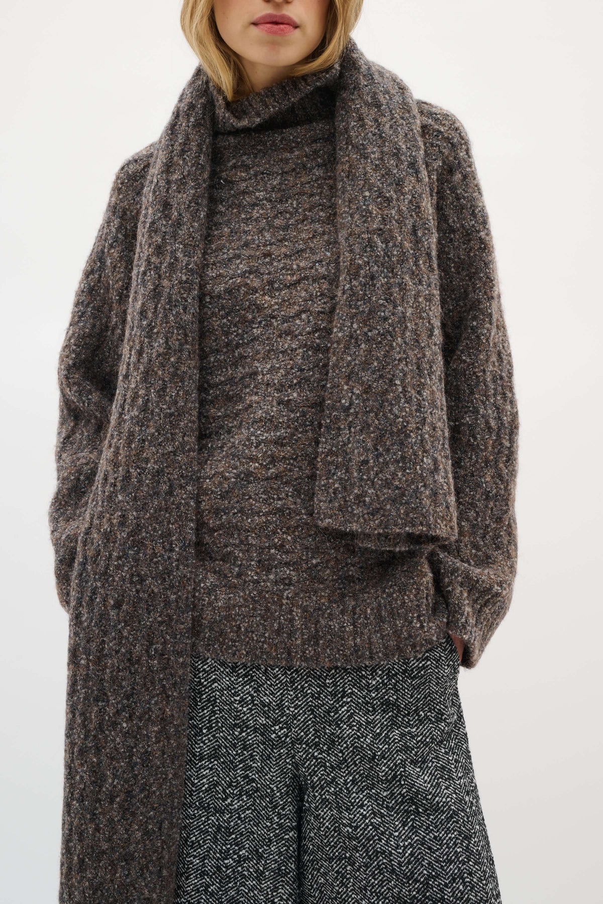Description: Foulard long en maille épaisse, conçu pour apporter chaleur et confort durant la saison froide. Sa texture riche lui confère un style moderne et polyvalent, idéal pour compléter vos tenues. Conseil style : portez-le en superposition sur un manteau ou un chandail pour une allure élégante et décontractée.