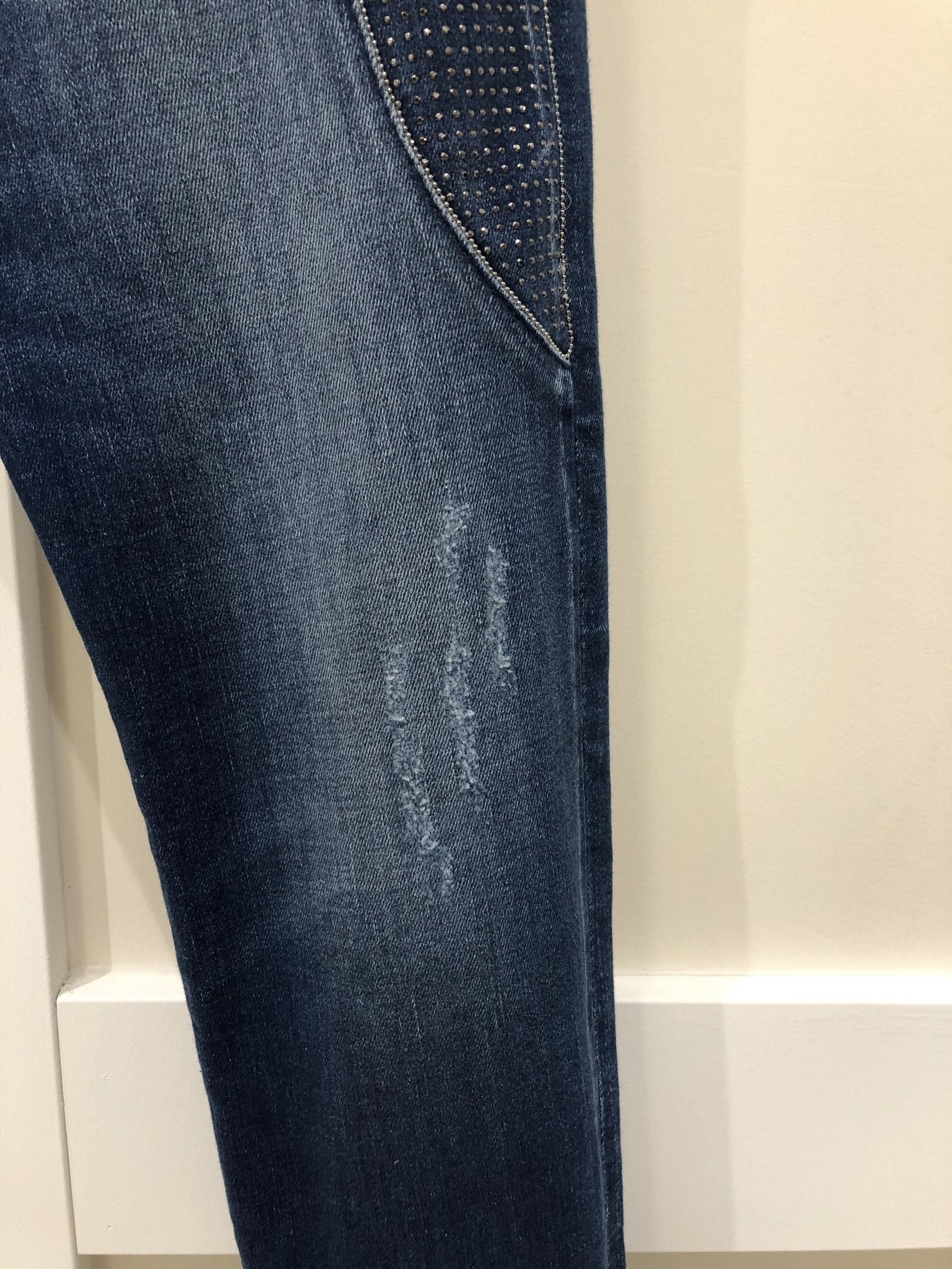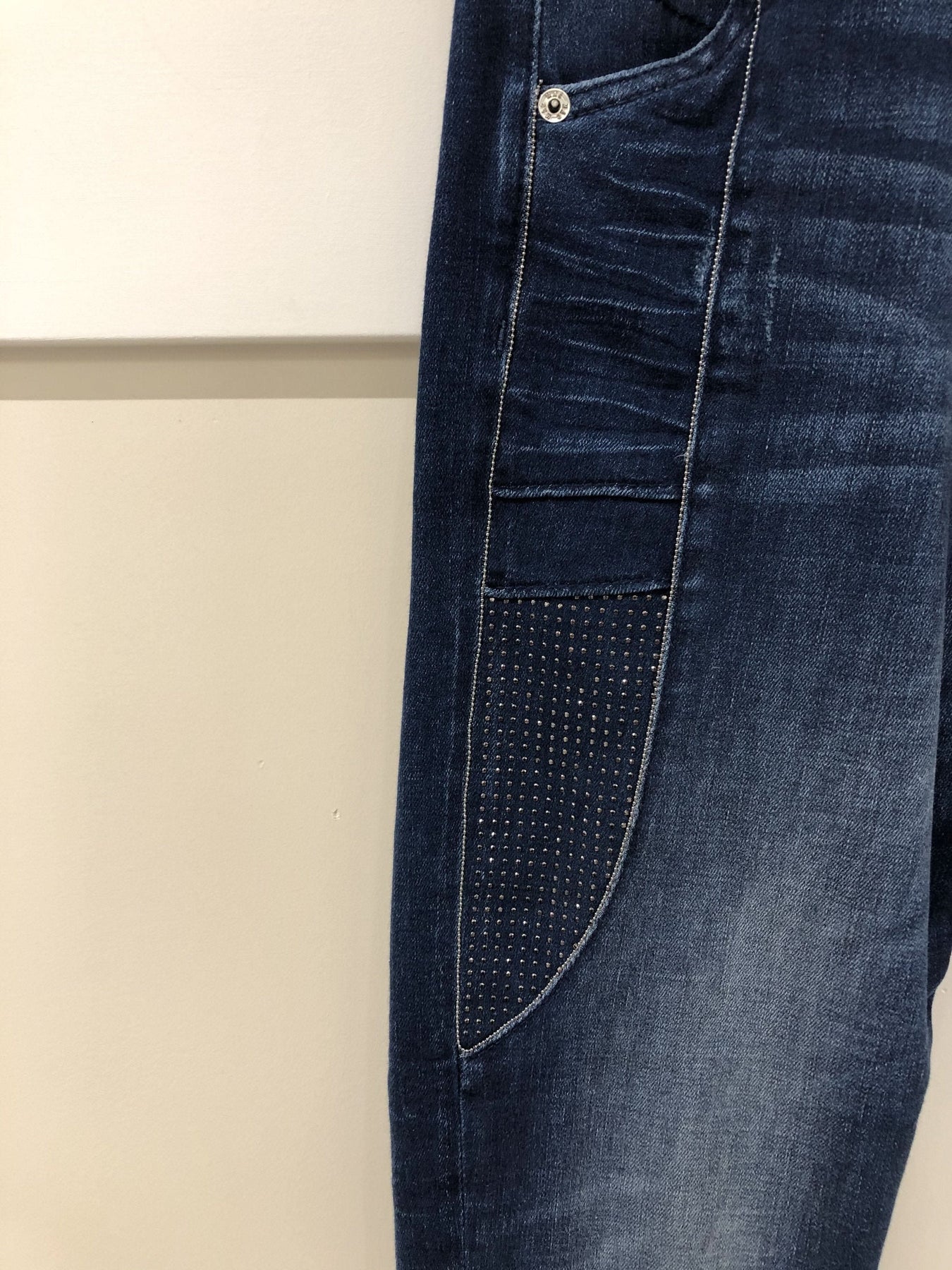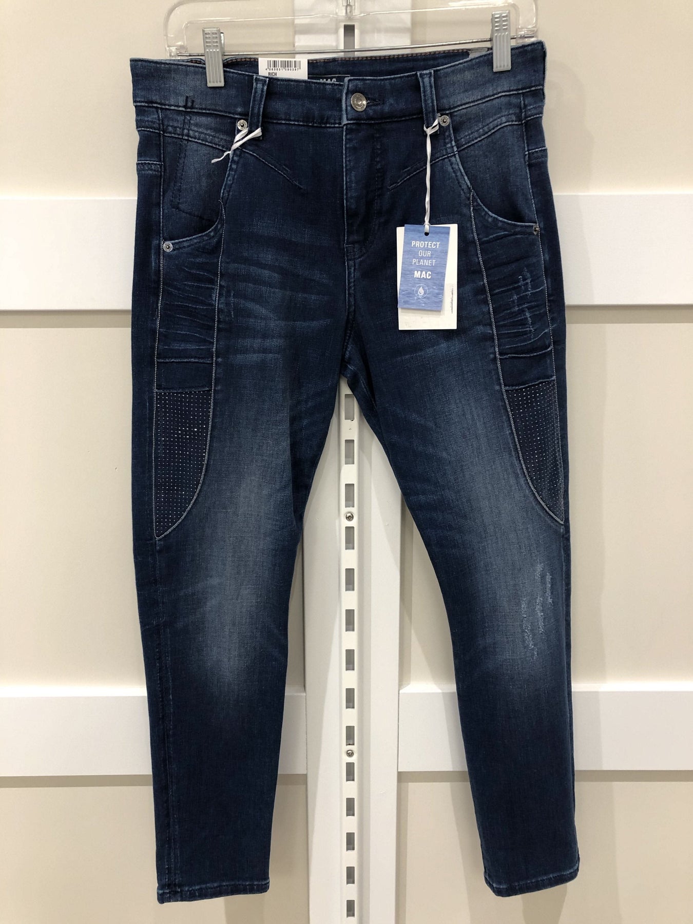 Jean MAC Jeans bleu délavé avec des brillants sur le côté des cuisses et sur les poches arrières. Coupe décontractée et ajustée. Modèle Rich.