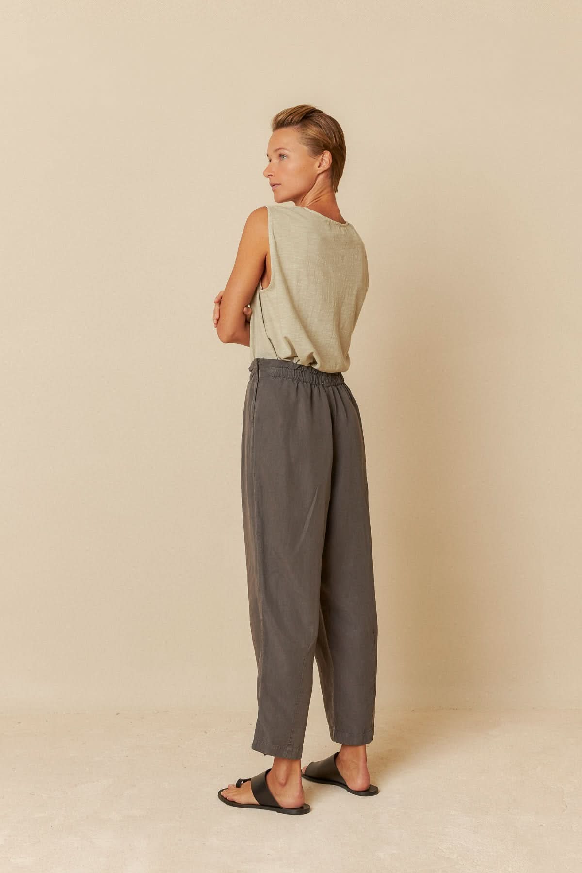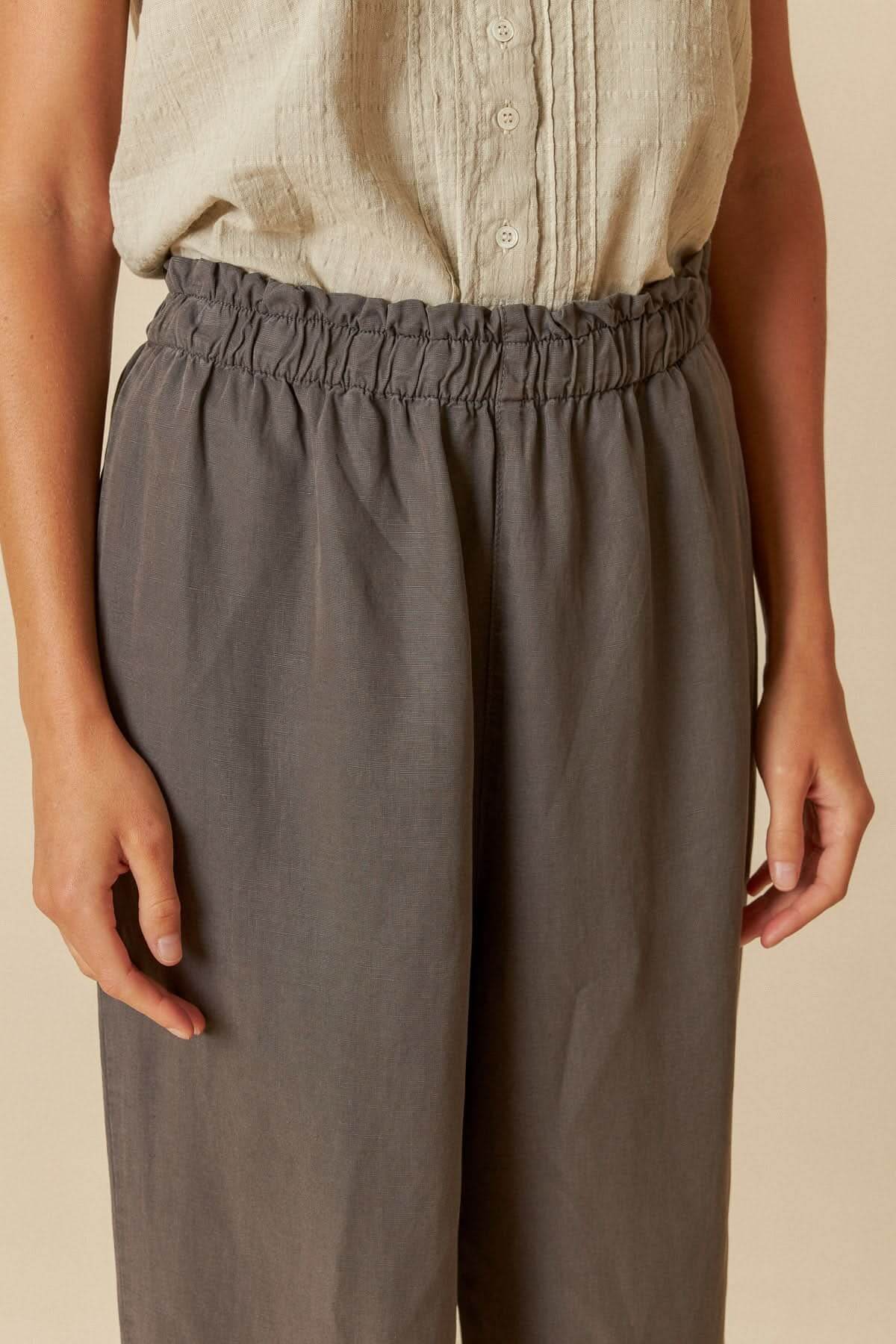 Femme portant un pantalon ample gris avec taille élastiquée et haut léger, style chic et décontracté.