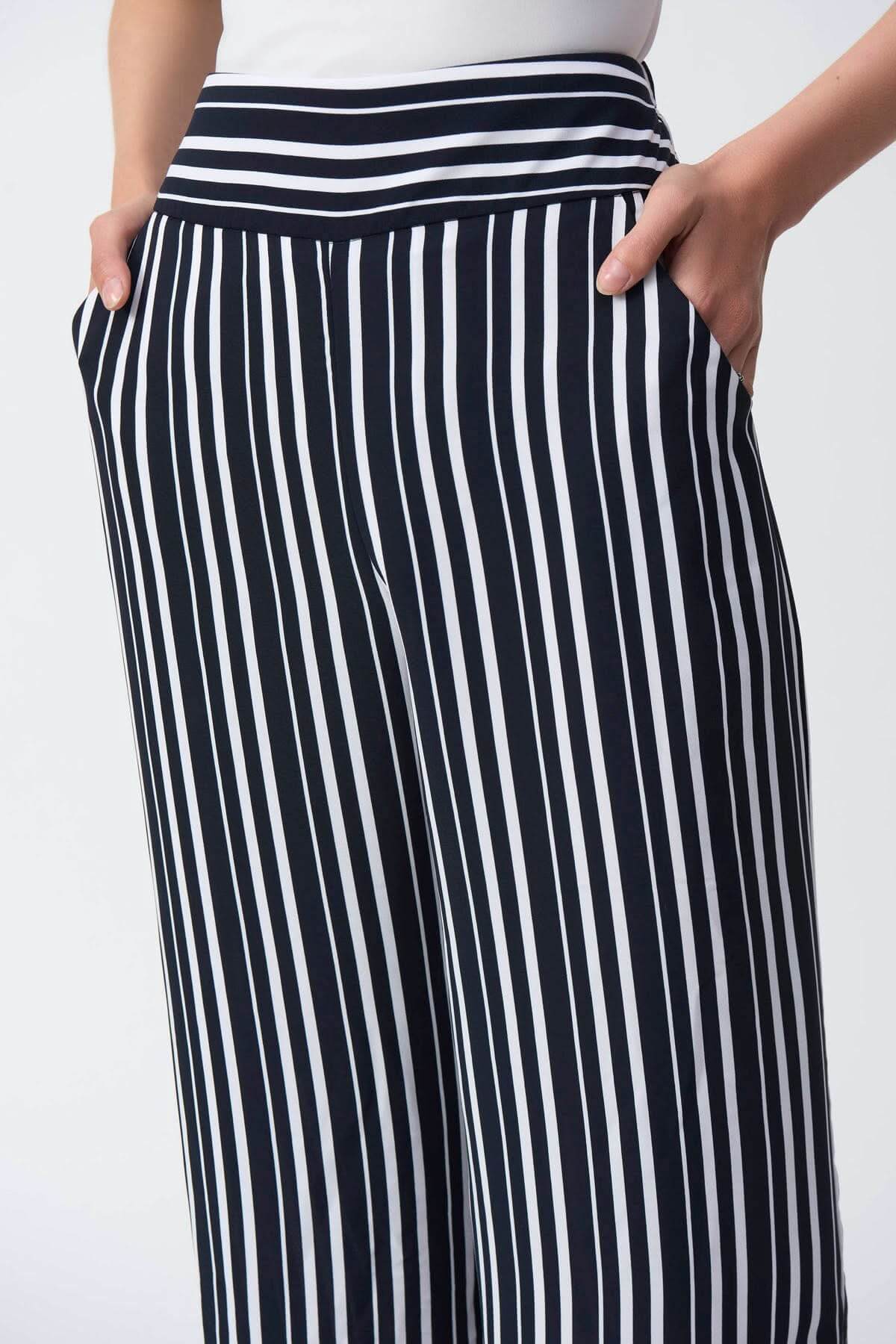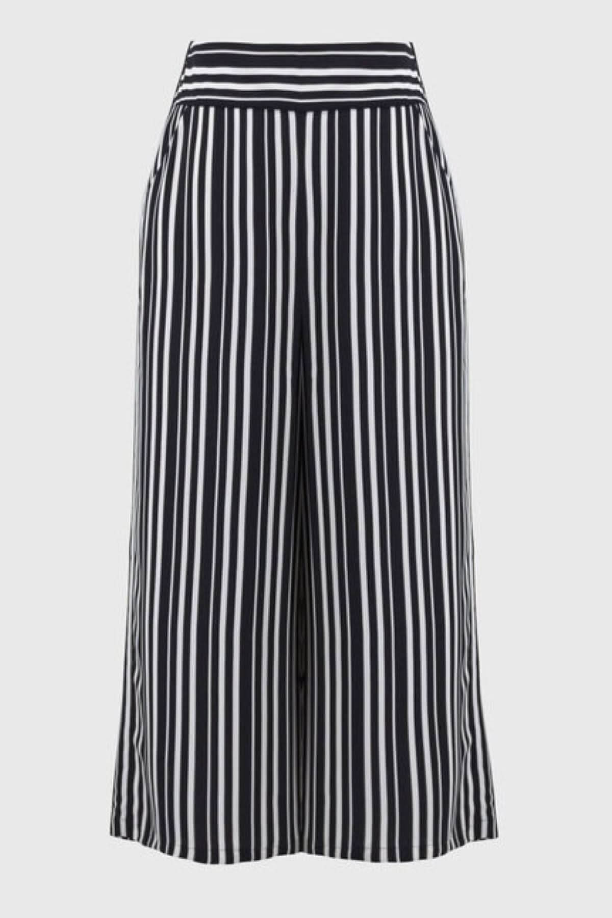 Description : Pantalon à rayures, léger et souple au fini soyeux, une large ceinture à l'avant et froncée à l'arrière garantissent un grand confort, sa jambe large longueur raccourcie crée une allure élégante et intemporelle. Un pantalon moderne au style décontracté.