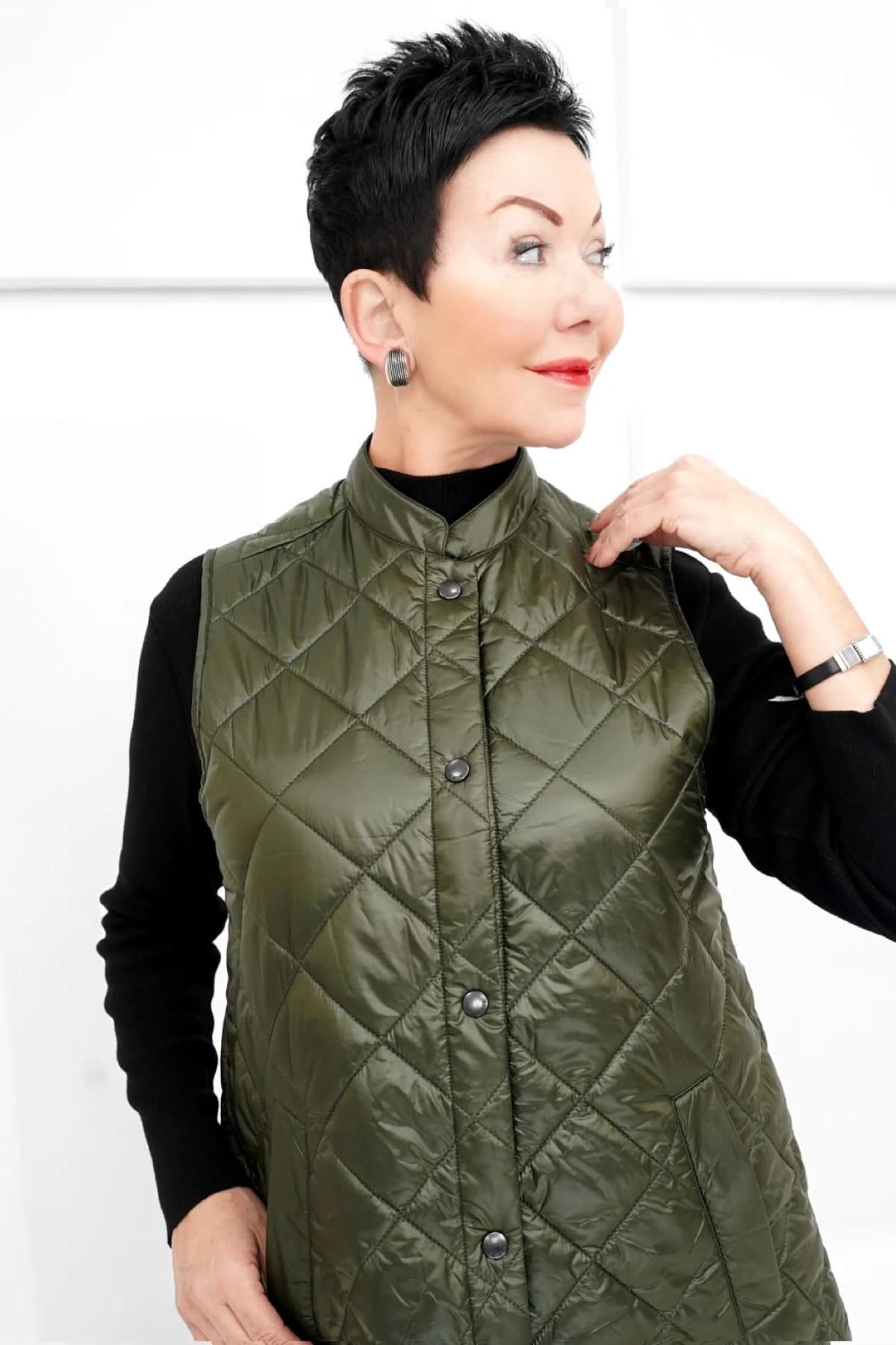 Gilet matelassé Pearl d'Ilse Jacobsen en vert olive, élégant et léger, parfait pour une superposition chic.