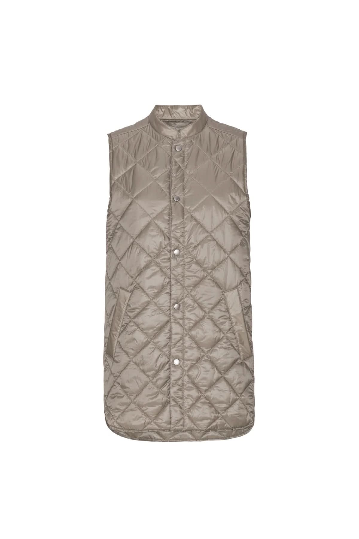Femme portant un gilet matelassé beige Ilse Jacobsen, élégant et léger, sans capuche, avec boutons-pression.