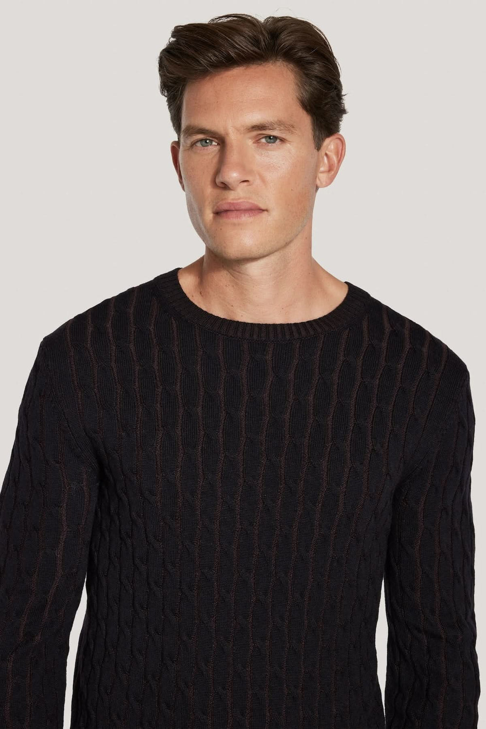 Description: Ce pull en laine mérinos se distingue par sa technique de tricot vanisé, créant un subtil jeu de couleurs et de textures pour un effet visuel raffiné. Son motif torsadé moderne et son épaule façonnée assurent une coupe élégante et ajustée. Polyvalent, il s’adapte aussi bien aux looks habillés qu’aux tenues décontractées.