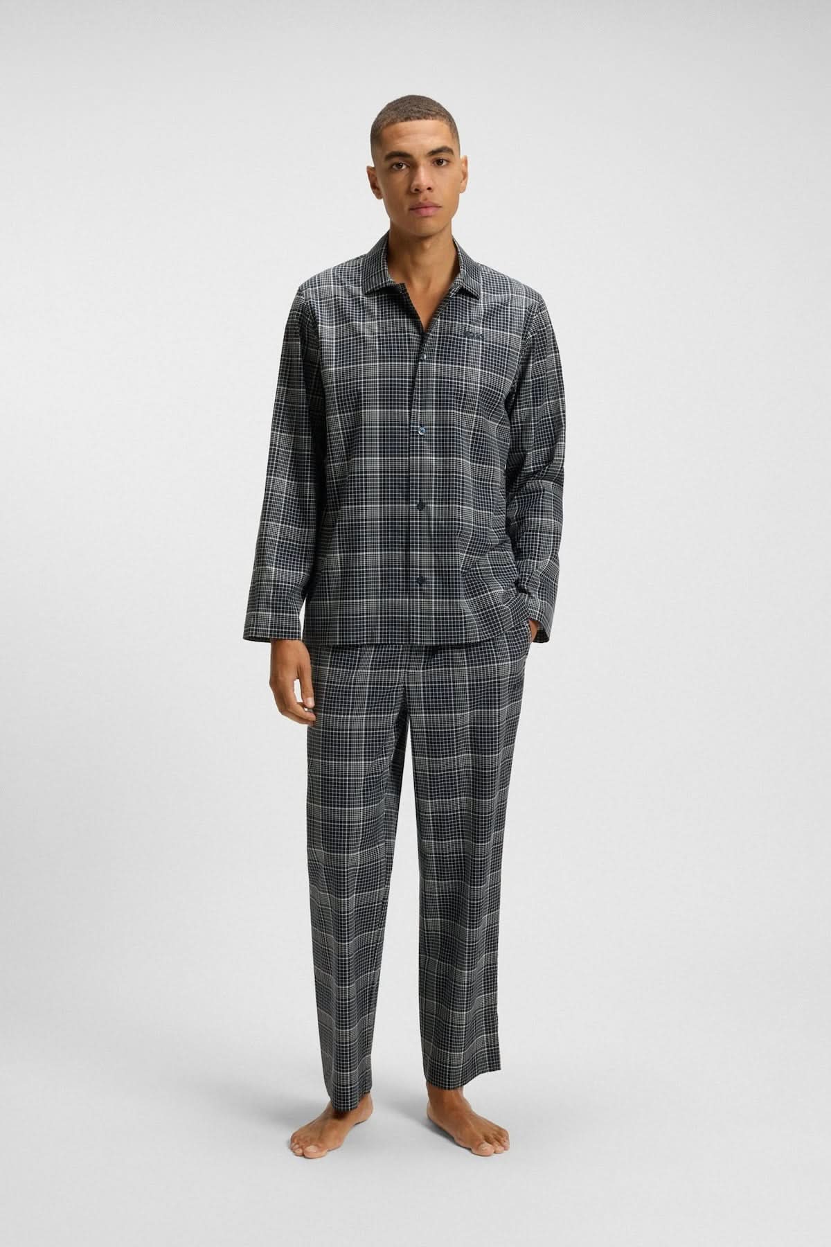 Homme portant Pyjama à carreaux en coton et lyocell BOSS, élégant et confortable, idéal pour les nuits fraîches et les soirées détente.