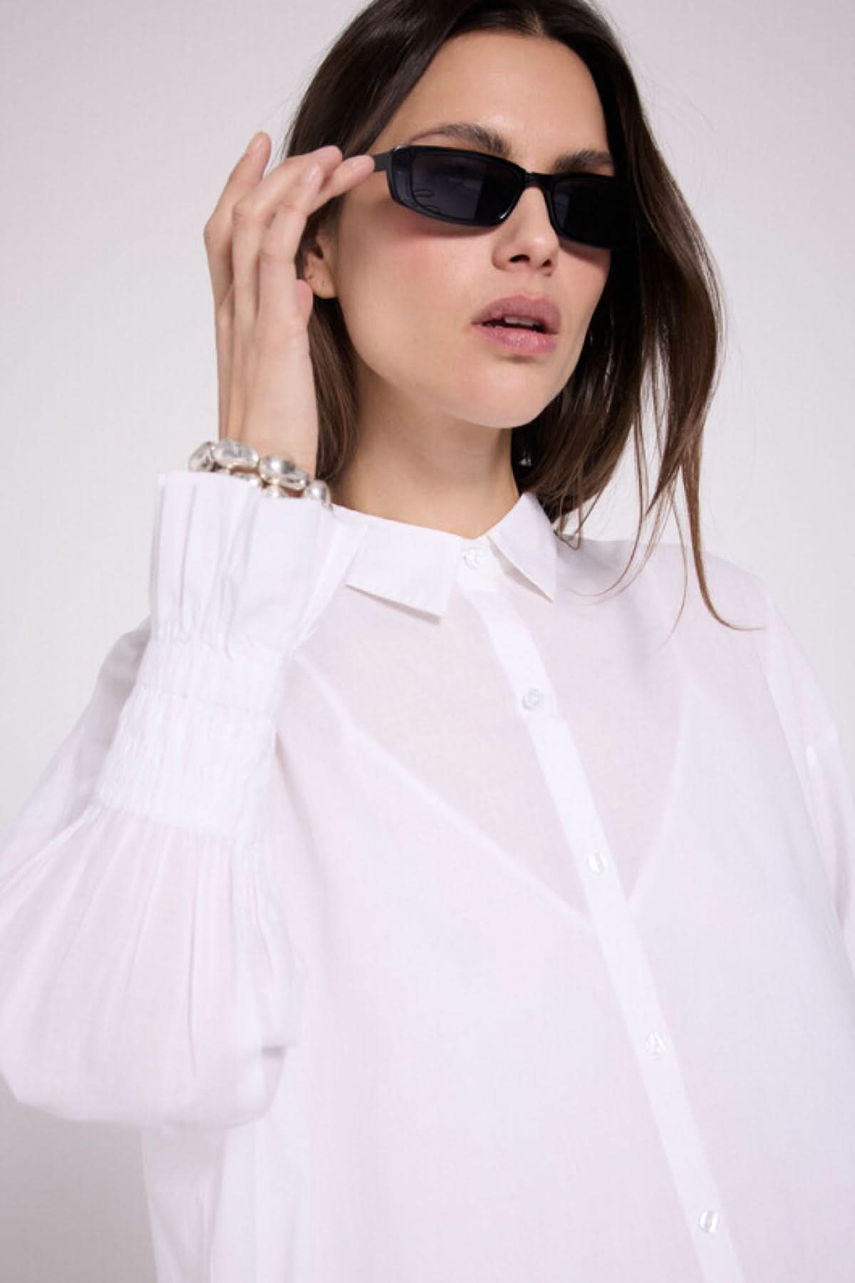 Description: Cette robe-chemise offre une coupe ample et aérienne avec patte de boutonnage dissimulée pour une ligne épurée et présente des détails plissés dans le dos et un petit cœur rouge brodé près du haut Les manches longues froncées aux poignets et l’ourlet légèrement arrondi apportent une touche moderne et décontractée.